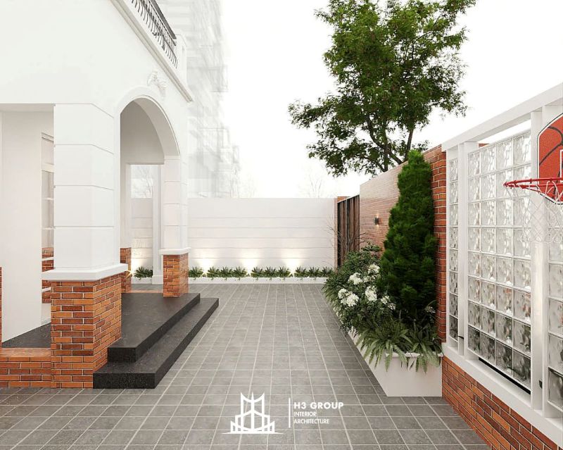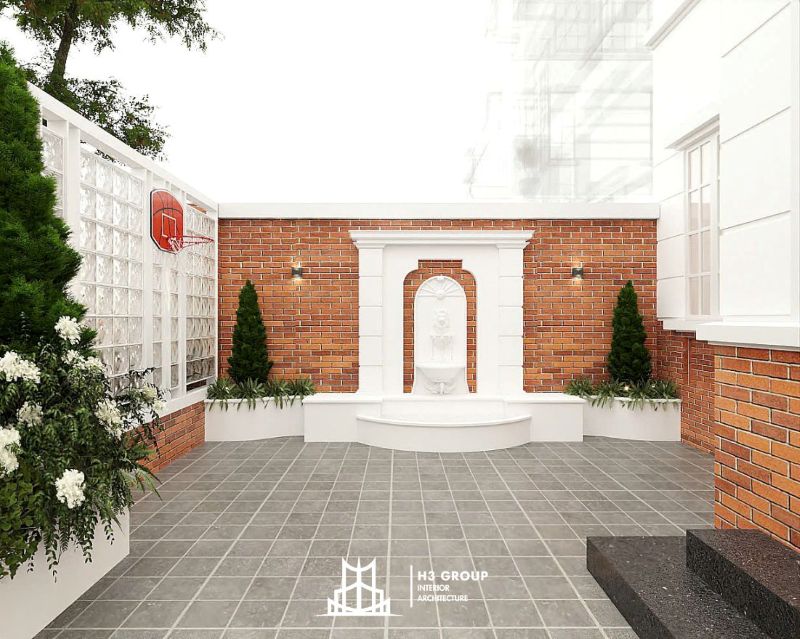 Khu vực sân vườn được đặc biệt chú trọng với các hàng cây xanh chạy dọc hàng rào, tạo cảm giác riêng tư, đồng thời giúp điều hòa không khí. Tại sân sau, một đài phun nước phong cách cổ điển trở thành điểm nhấn thư giãn. Ngoài ra, gia chủ cũng yêu cầu bố trí thêm bảng rổ thể thao nhỏ gọn để phục vụ sinh hoạt cho các thành viên trong gia đình.