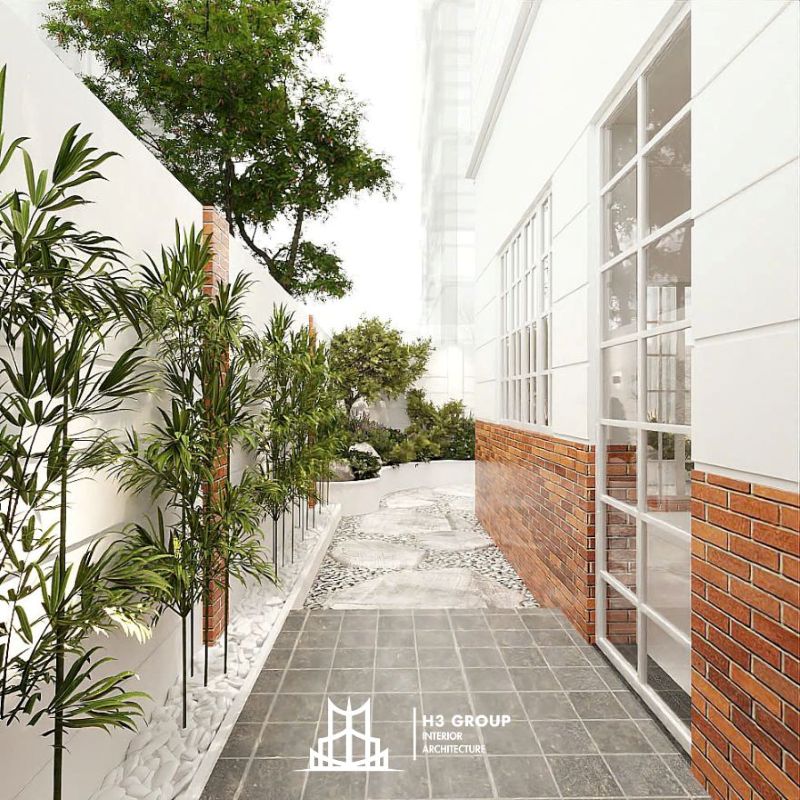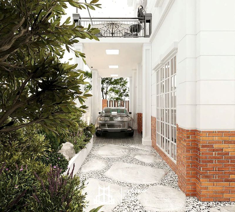 Gara ô tô được cải tạo lại phần trần, thêm đèn chiếu sáng gián tiếp để không gian trở nên sáng và thoáng hơn. Lối đi bên hông được lát đá cuội kết hợp trồng cây tạo cảnh quan sinh động.