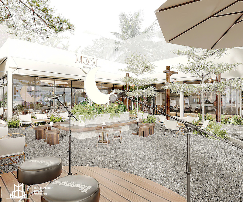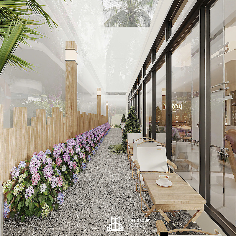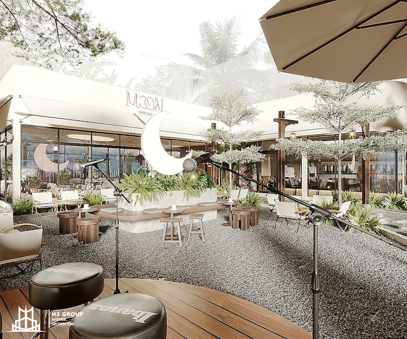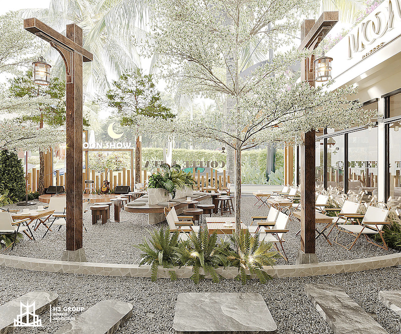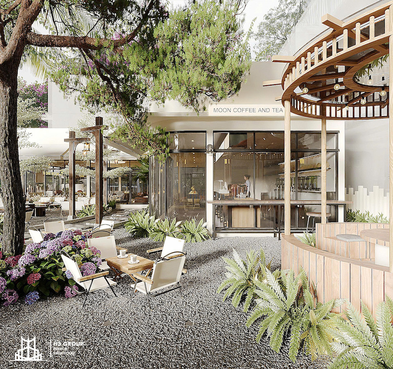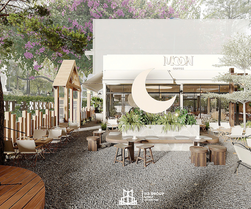 Không gian sân vườn Moon Coffee chính là linh hồn của tổng thể thiết kế, mang đến trải nghiệm thư giãn, gần gũi với thiên nhiên nhưng vẫn hiện đại.