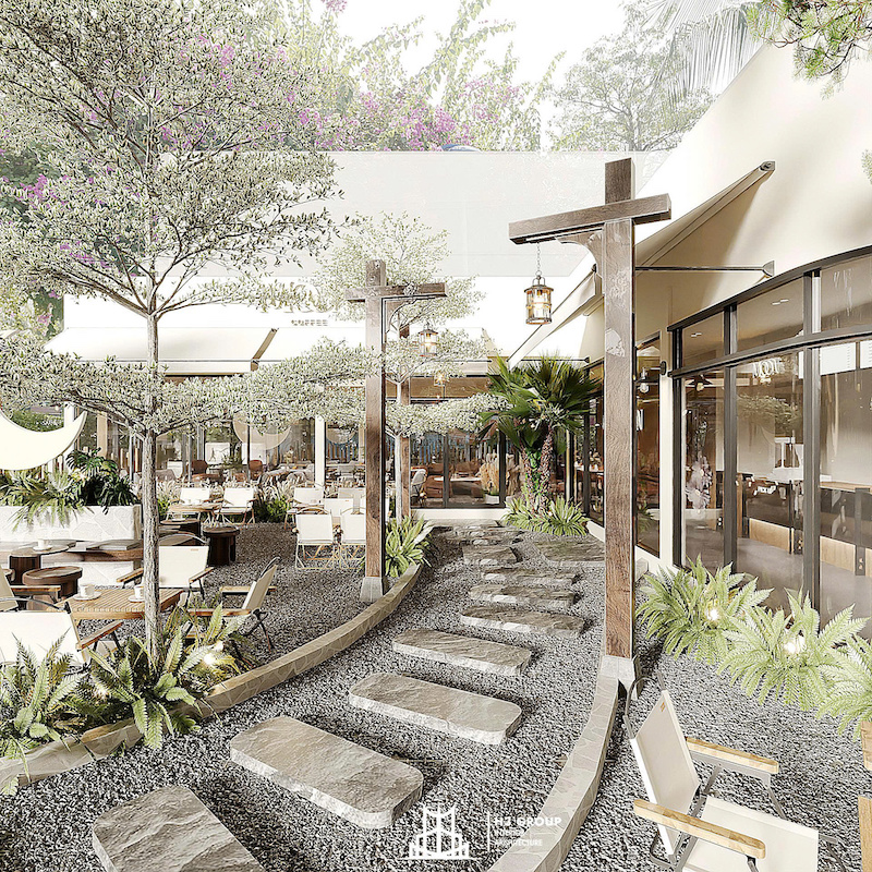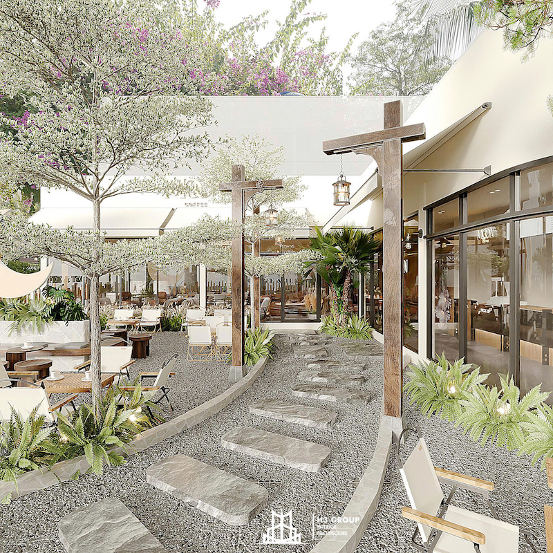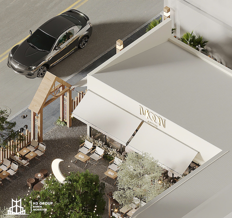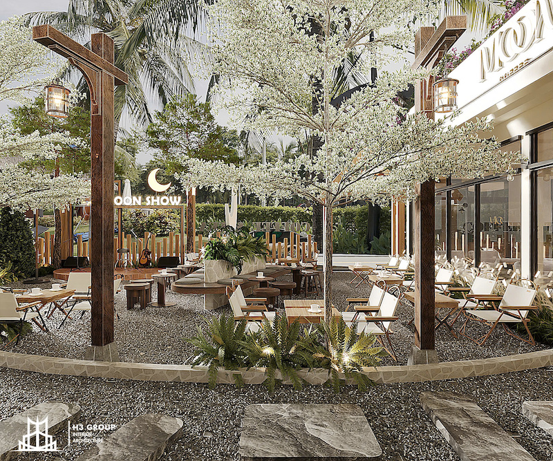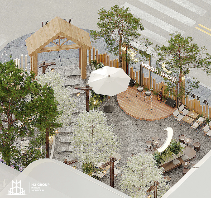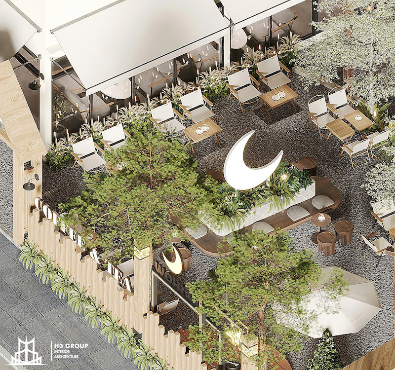 Không gian sân vườn Moon Coffee chính là linh hồn của tổng thể thiết kế, mang đến trải nghiệm thư giãn, gần gũi với thiên nhiên nhưng vẫn hiện đại.