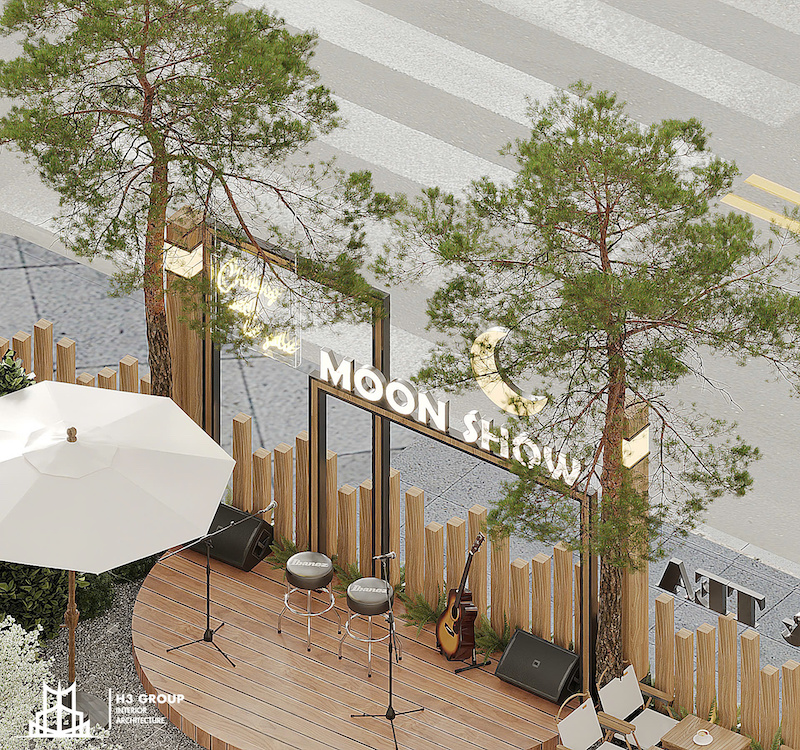 Ngoài ra, cảnh quan xanh được bố trí xen kẽ giữa các khu vực ngồi, kết hợp mảng hoa nhỏ và cây cảnh tán lớn, mang lại không gian thư giãn và dễ chịu, khiến khách hàng muốn ở lại lâu hơn. Không gian sân vườn còn được trang bị sân khấu nhỏ ngoài trời để tổ chức các đêm nhạc cuối tuần, tạo điểm nhấn sống động và trải nghiệm đặc biệt cho Moon Coffee.