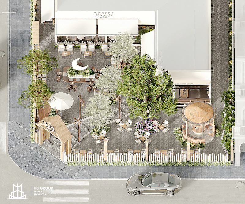 Thiết kế quán cafe Moon Coffee được bố trí khoa học, hợp lý, vừa đủ để tránh cảm giác chật chội, đồng thời giảm tiếng ồn, mang đến sự thoải mái cho khách hàng. Khu vực sân vườn được quy hoạch thành các cụm bàn ghế cách nhau hợp lý, theo trục thẳng và lối đi uốn lượn nhẹ nhàng, tạo cảm giác tự nhiên nhưng vẫn gọn gàng.