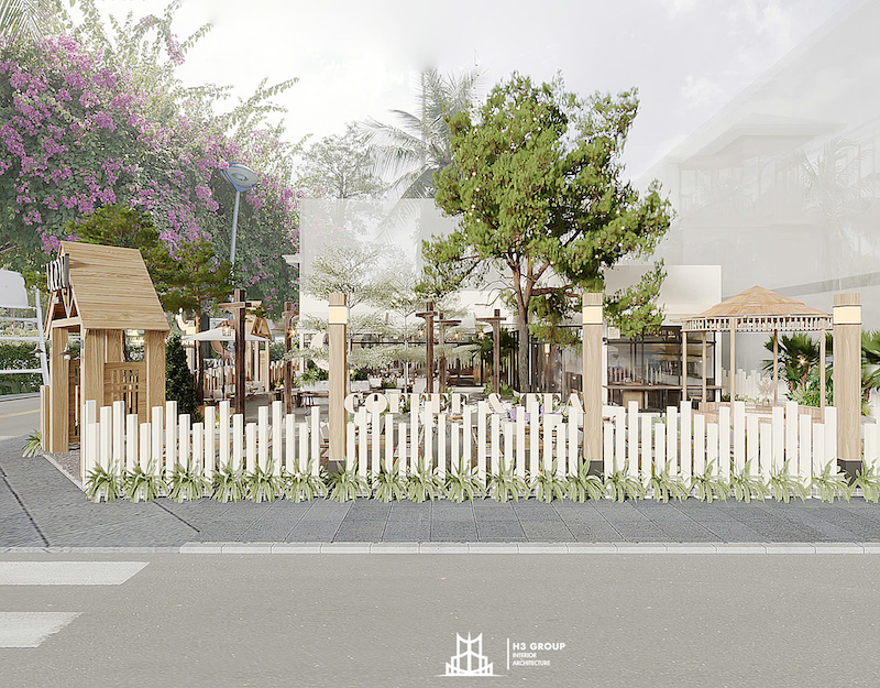 Những hàng rào mở bằng gỗ vừa phân định khu vực, vừa kết nối linh hoạt với không gian xung quanh, giúp ánh sáng và gió tự nhiên lan tỏa, đồng thời thu hút khách từ bên ngoài.