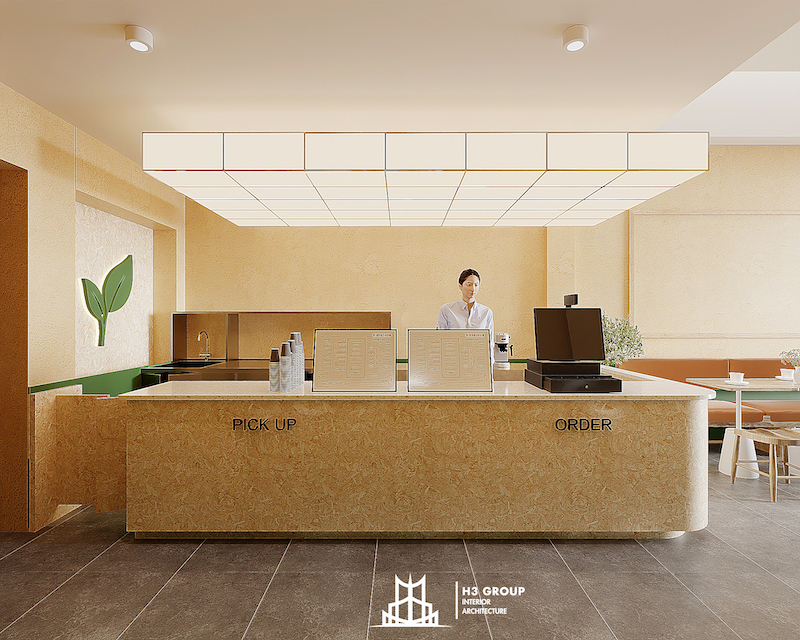 Thiết kế này không chỉ cải thiện chất lượng ánh sáng mà còn làm tăng đáng kể cảm giác thoáng của không gian. Nội thất được bố trí theo hướng tối giản và tinh gọn, giảm thiểu chi tiết rườm rà để tối ưu hóa diện tích sử dụng. Mọi sự chú ý được dồn vào hai khu vực quan trọng nhất là quầy bar và góc check-in – nơi giữ chân khách hàng, tạo trải nghiệm trực tiếp và tăng tính chia sẻ trên mạng xã hội.