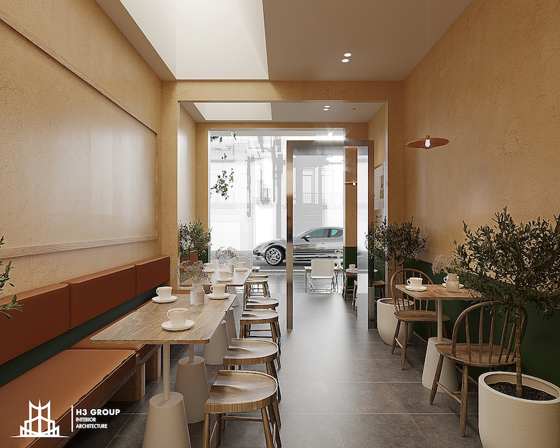 Nội thất cần được bố trí linh hoạt, sử dụng đường nét tối giản để tiết kiệm không gian, đồng thời tạo ra nhiều góc “check-in” hấp dẫn – nơi khách hàng có thể lưu giữ và chia sẻ trải nghiệm tại quán. Khoảng giật lùi phía trước mặt tiền cũng được tận dụng tối đa để mở rộng không gian sử dụng. Thay vì chỉ là khu vực đệm, phần sân ngoài trời này được thiết kế trở thành không gian phục vụ chính, đặc biệt vào buổi tối, kết hợp vật liệu, ánh sáng và cảnh quan một cách tinh tế để tạo sự thông thoáng, gần gũi mà vẫn hài hòa với tổng thể.