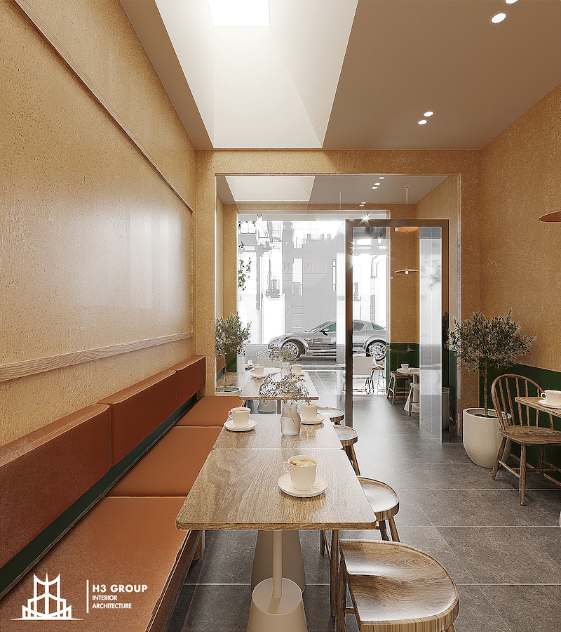 Bên trong quán được xử lý một cách thông minh để vừa đảm bảo công năng, vừa tạo cảm giác rộng rãi và thoáng đãng trong diện tích hạn chế. Một trong những điểm nổi bật là việc tận dụng khoảng thông tầng cũ để thiết kế trần lightbox xuyên sáng – giải pháp tạo hiệu ứng giếng trời giả, giúp đưa ánh sáng tự nhiên lên cao và mở rộng chiều sâu thị giác.