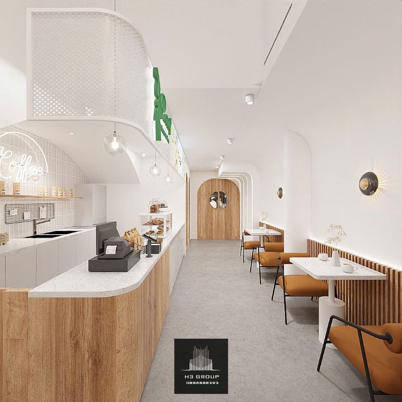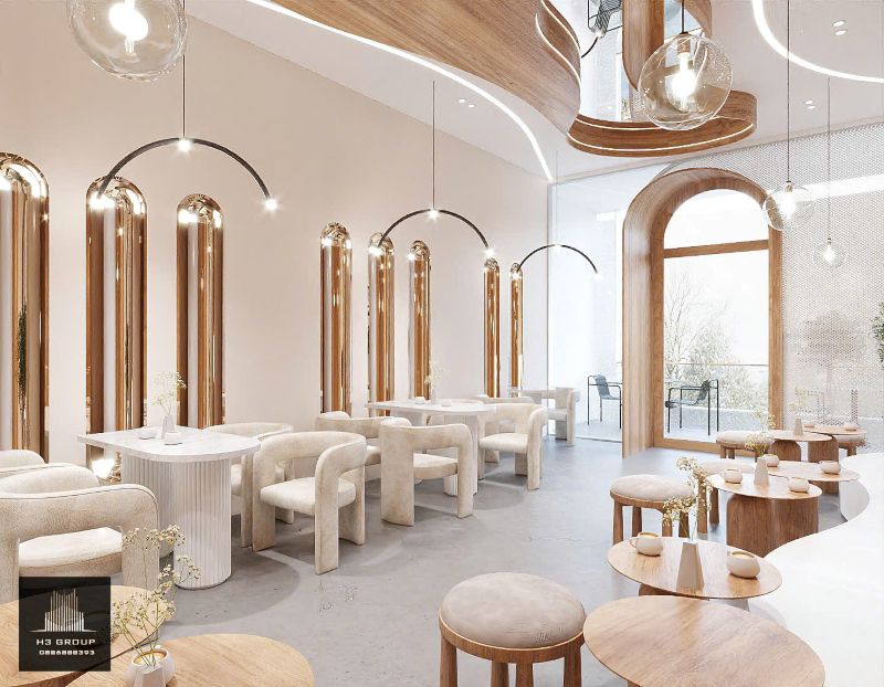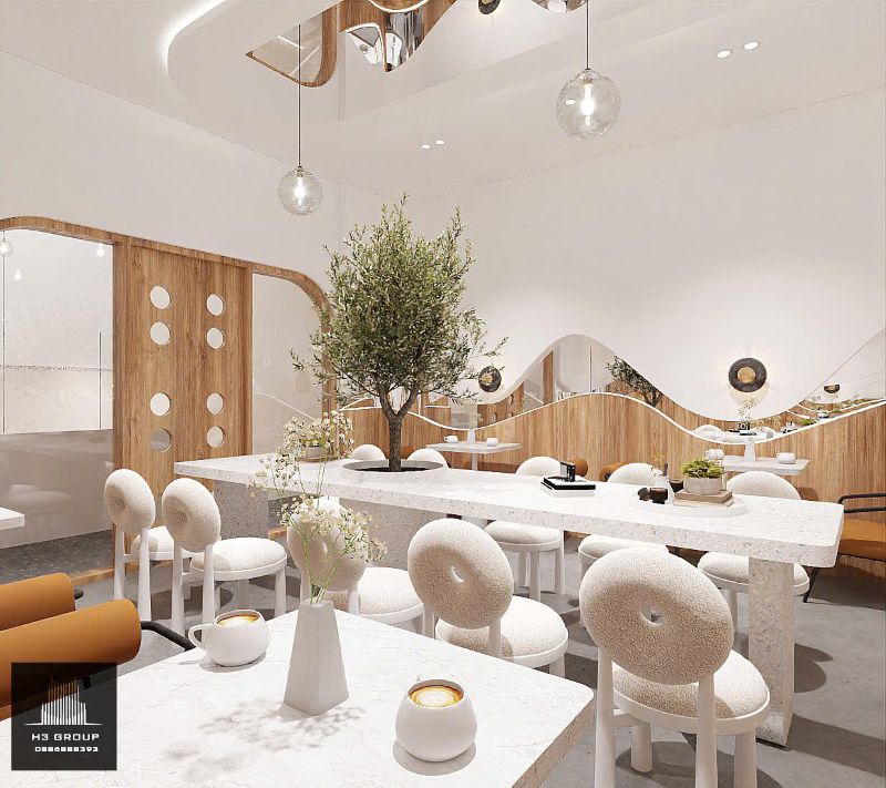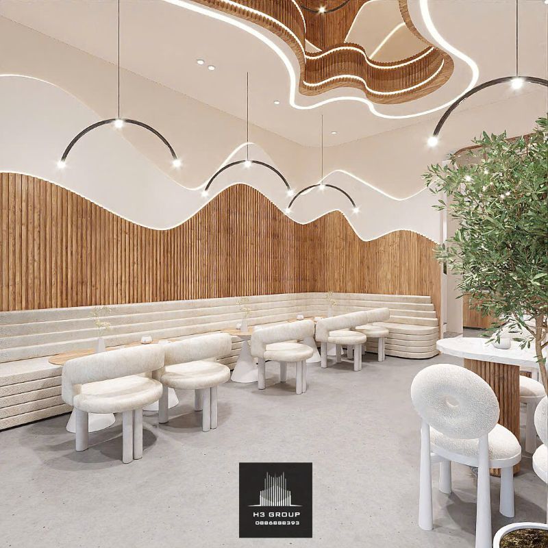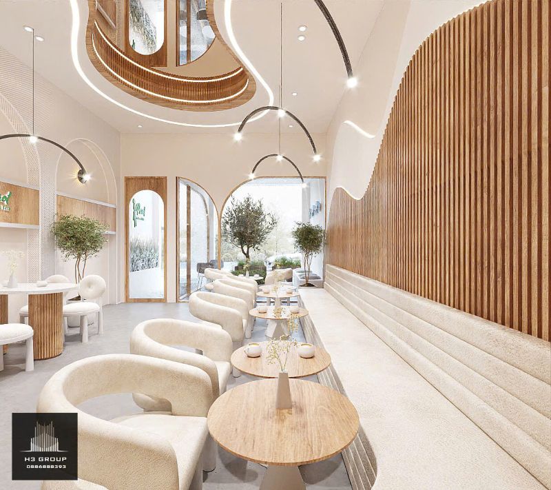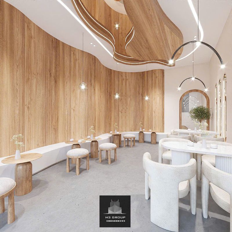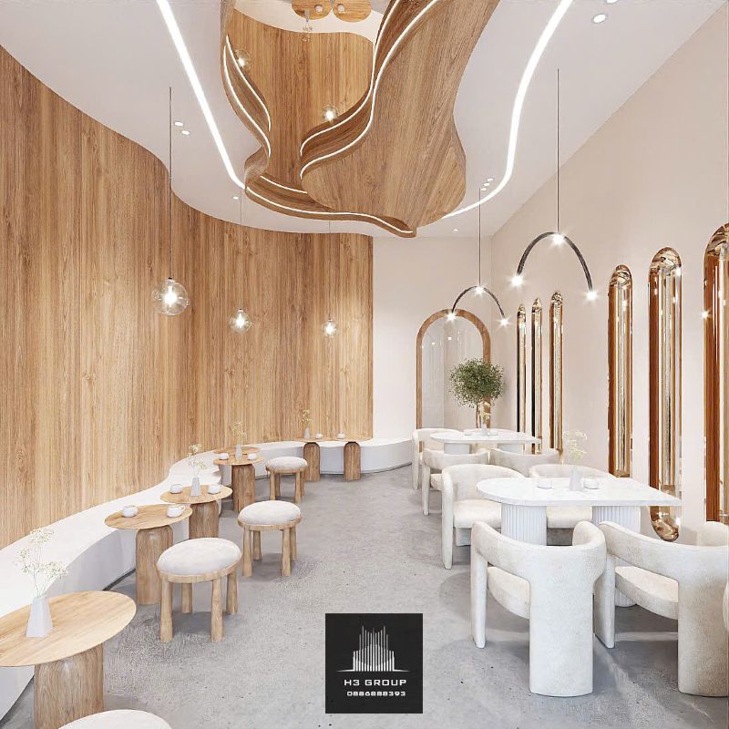 Quán cafe này được thiết kế theo phong cách modern organic, kết hợp giữa đường cong mềm mại, chất liệu tự nhiên và tông màu trung tính sáng. Điểm nhấn lớn nằm ở trần và tường dạng nghệ thuật, giúp tạo ra trải nghiệm không gian độc đáo – rất phù hợp với giới trẻ và khách yêu thích những không gian “Instagrammable”.