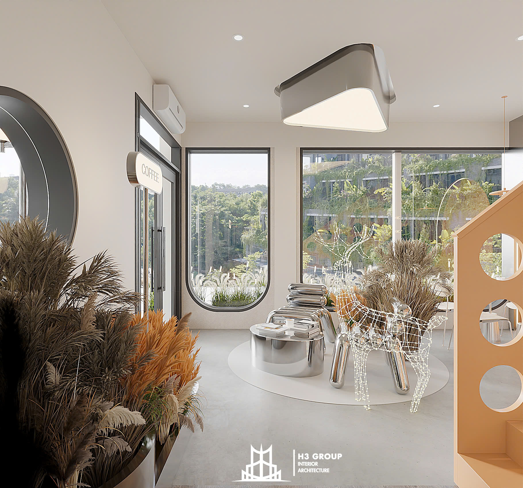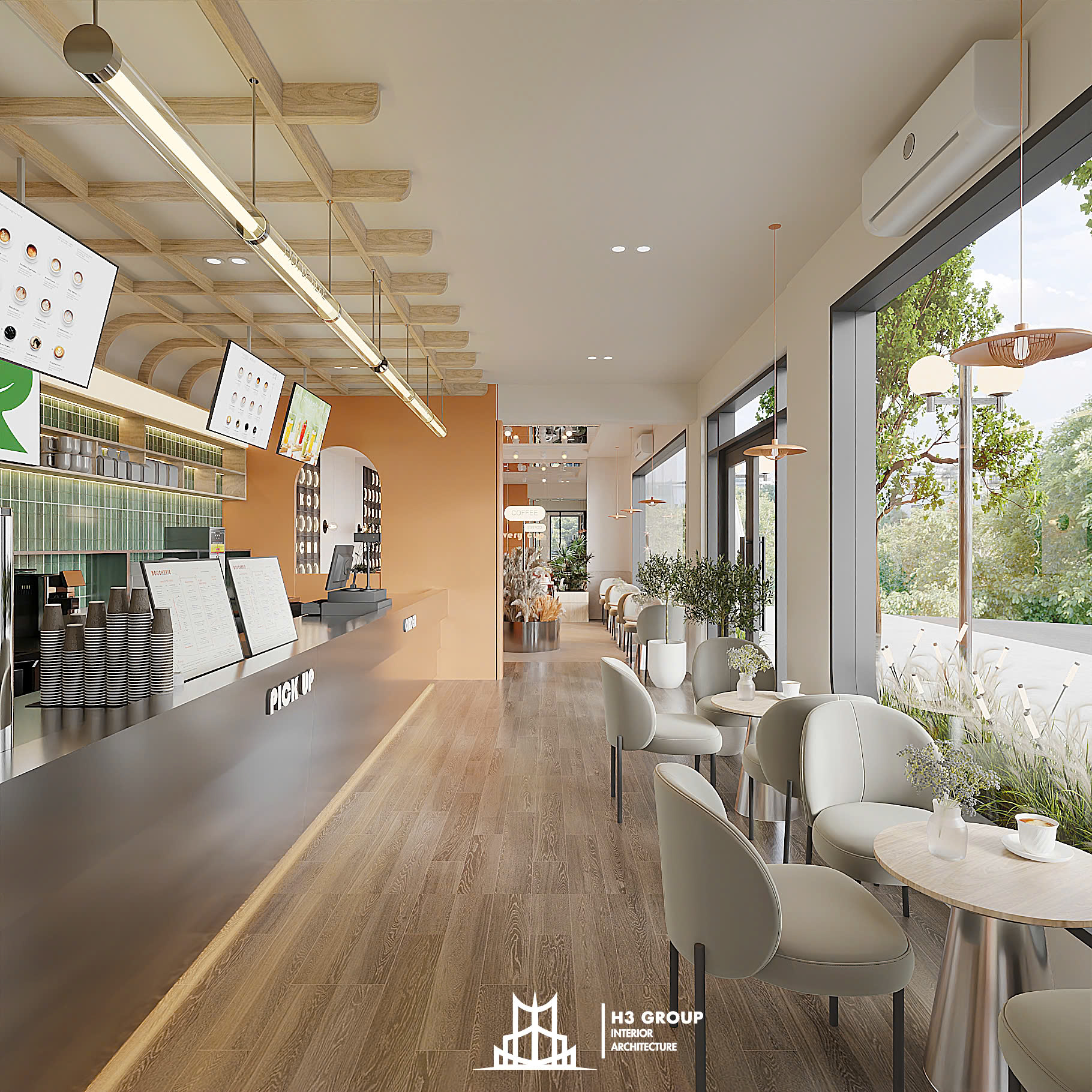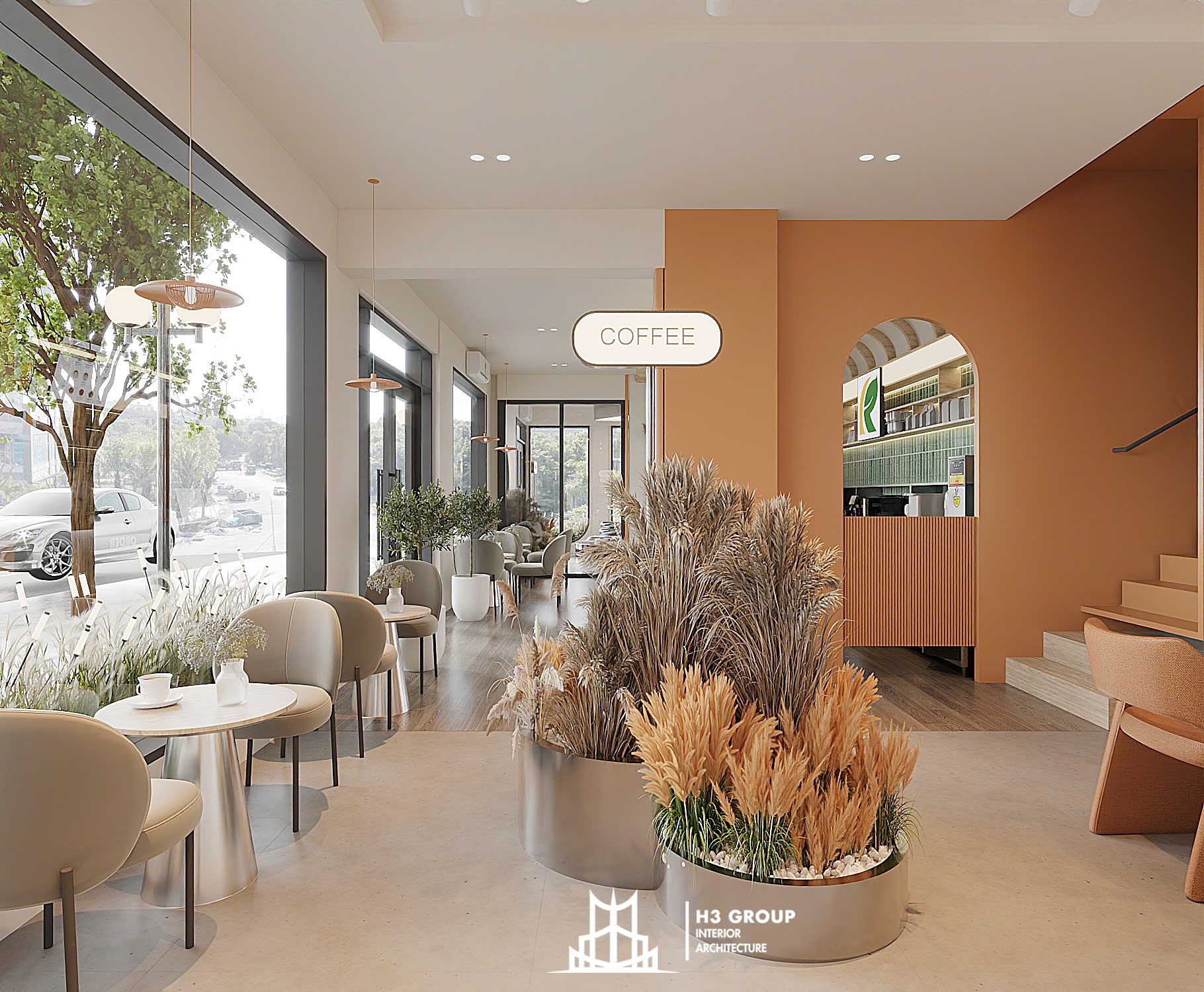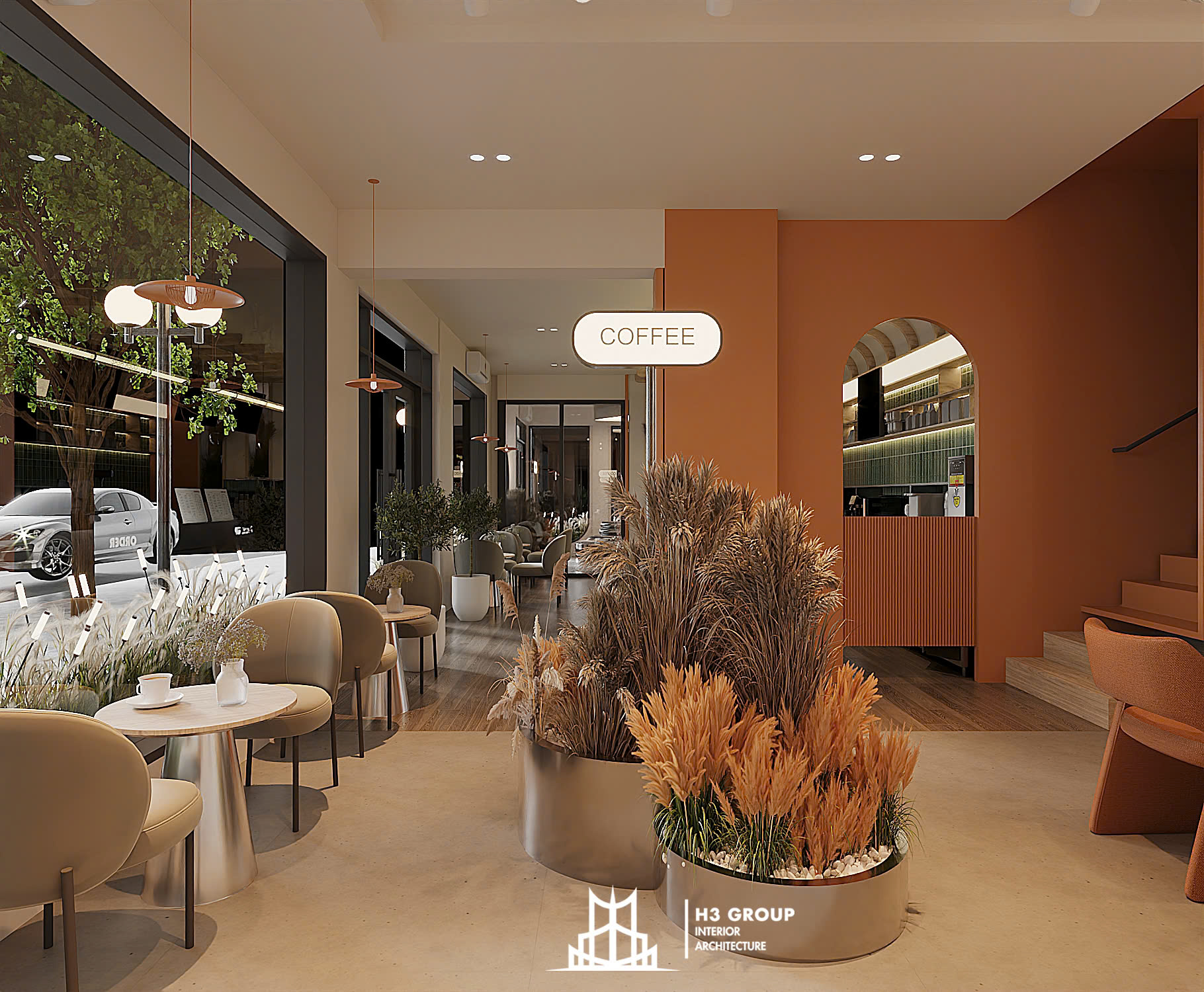 Khu vực cafe được bố trí bên phải quầy bar, mang đến sự thuận tiện trong di chuyển, đồng thời tạo nên dòng chảy hợp lý giữa các khu vực. Tầng 2 – sân vườn nhỏ được thiết kế mở với cây xanh và ánh sáng tự nhiên, là nơi lý tưởng dành cho khách hàng yêu thích sự thư giãn, gần gũi thiên nhiên.