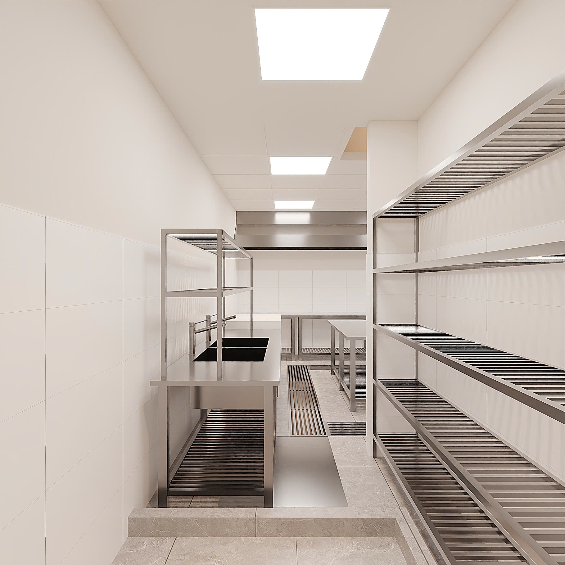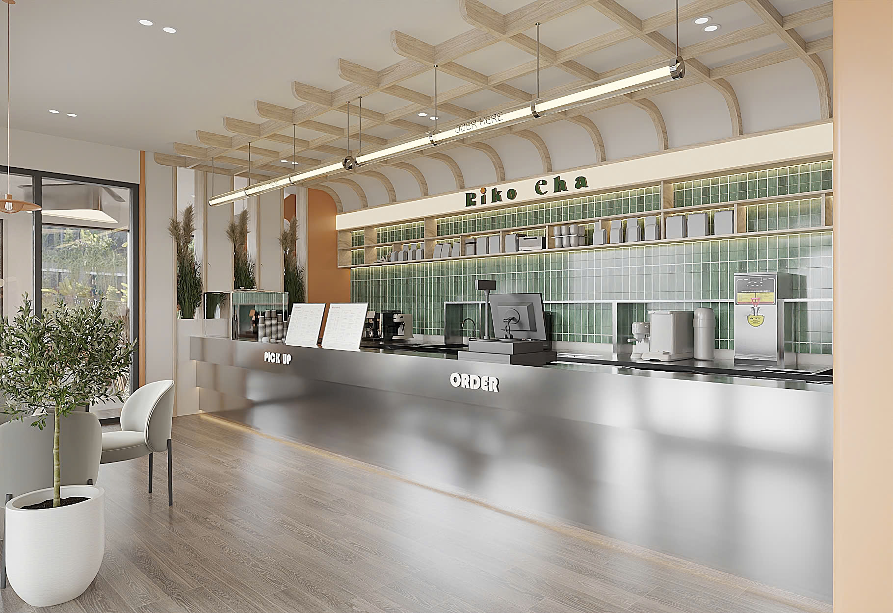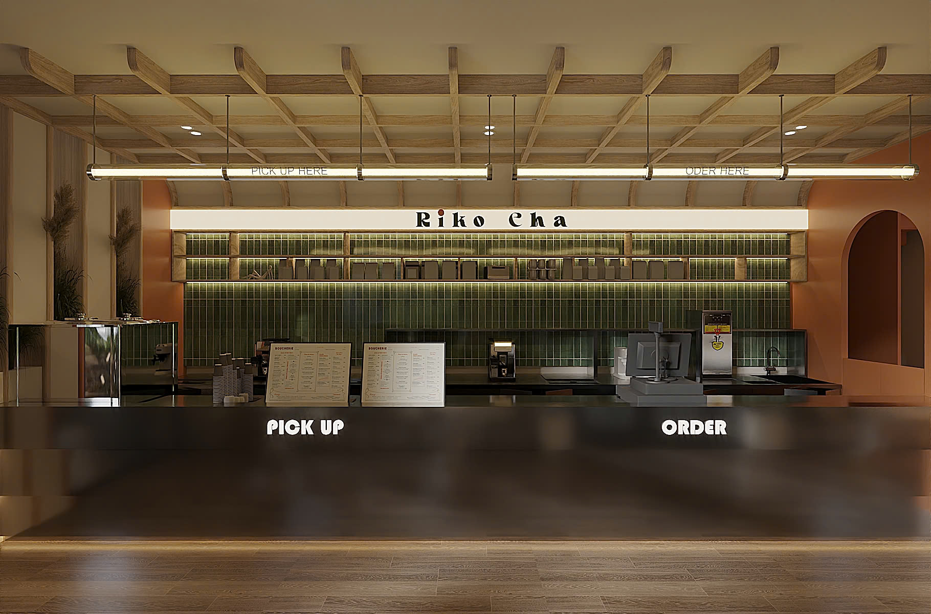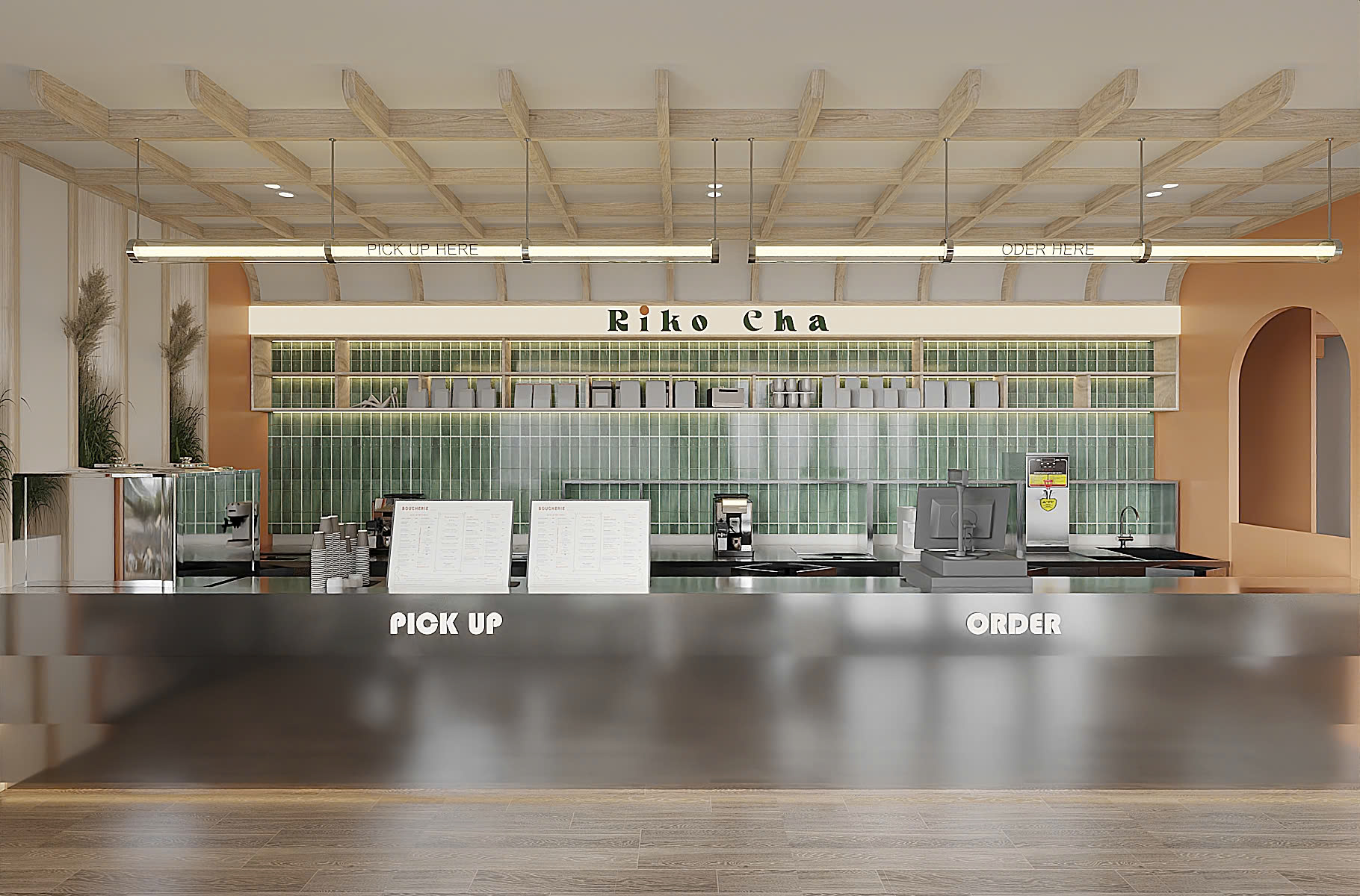 Được xem là “trái tim” của Riko Cha, nơi hội tụ toàn bộ năng lượng sáng tạo và trải nghiệm vị giác của khách hàng. Thiết kế quầy bar sử dụng vật liệu inox sáng bóng làm chủ đạo, kết hợp cùng những chi tiết trang trí tinh giản để mang lại cảm giác hiện đại, sạch sẽ và chuyên nghiệp. Phía sau quầy là hệ kệ trưng bày được bố trí gọn gàng, kết hợp cùng mảng trần gỗ ấm áp, giúp cân bằng không gian và giảm bớt cảm giác lạnh từ chất liệu kim loại.
