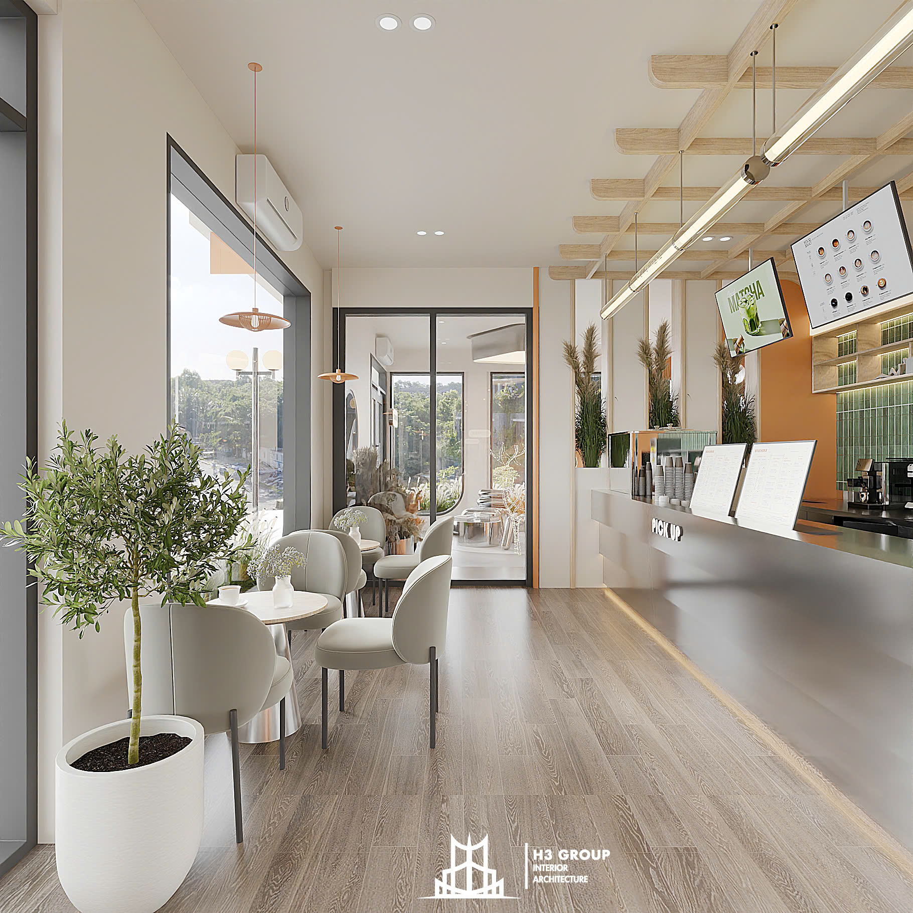 Không gian quán được định hình theo phong cách hiện đại – trẻ trung – giàu tính thẩm mỹ, mang lại trải nghiệm mới mẻ và ấn tượng cho khách hàng. Điểm nhấn của thiết kế nằm ở việc sử dụng nhiều chi tiết decor tinh tế và yếu tố trang trí phức tạp có chọn lọc. Sự sắp đặt khéo léo này giúp không gian trở nên sinh động, cuốn hút hơn nhưng vẫn giữ được tính hài hòa, gọn gàng và không gây rối mắt.