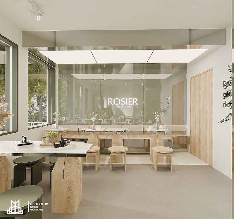 Tông gỗ vàng nhạt được sử dụng làm điểm nhấn, cân bằng lại sự mát mẻ của sắc xanh, giúp tổng thể trở nên ấm áp – dễ chịu – đúng tinh thần trẻ trung và đổi mới của chuỗi Rosier.