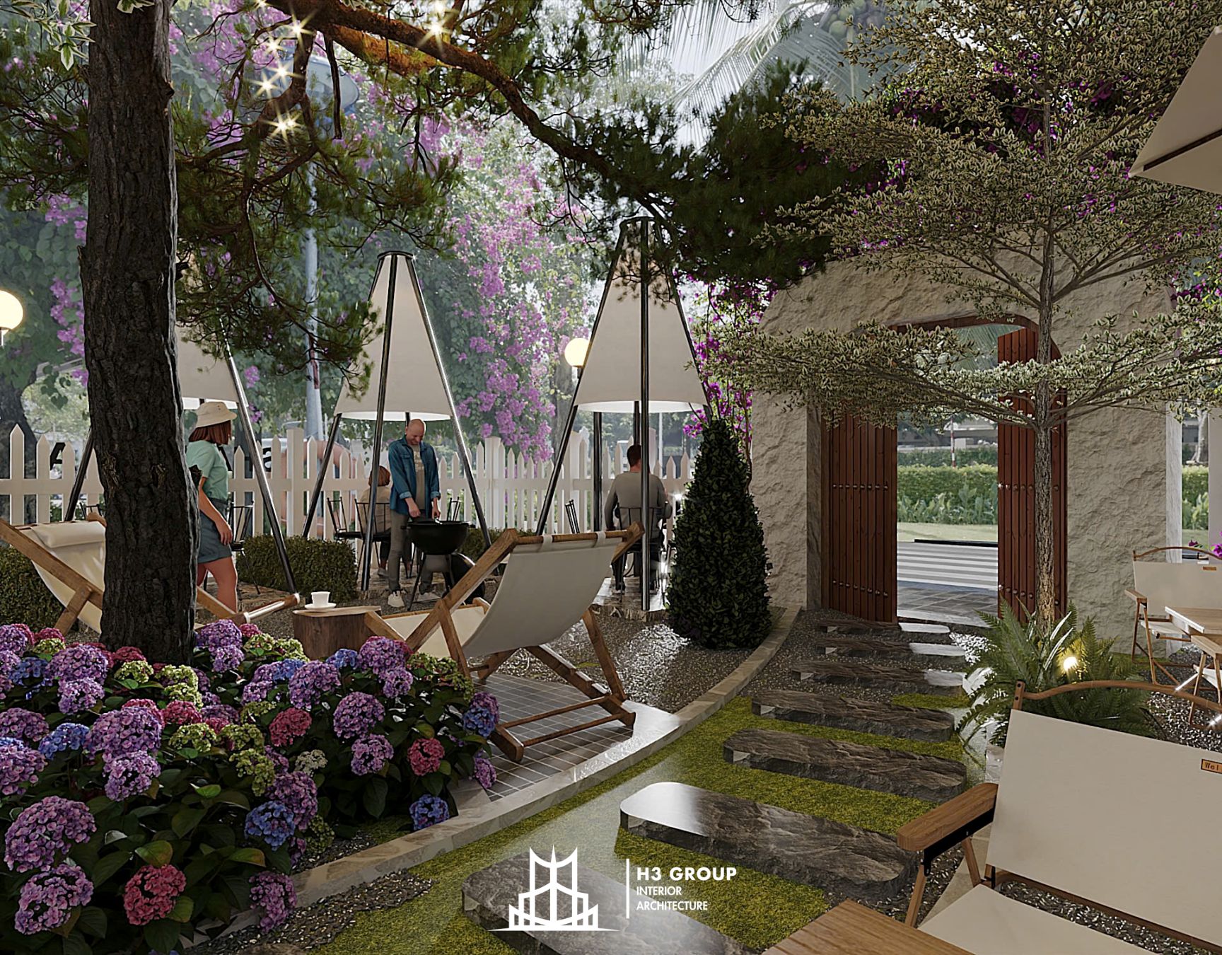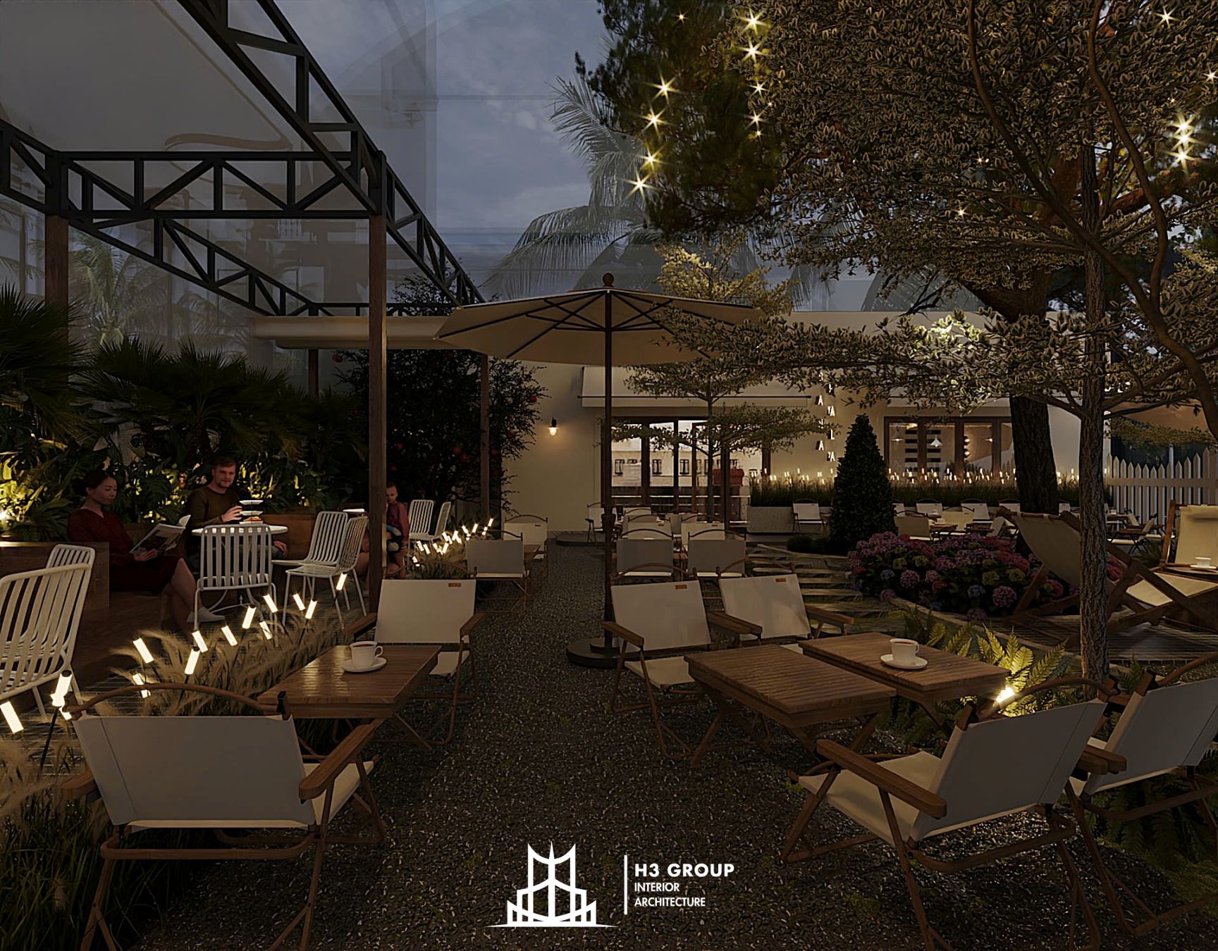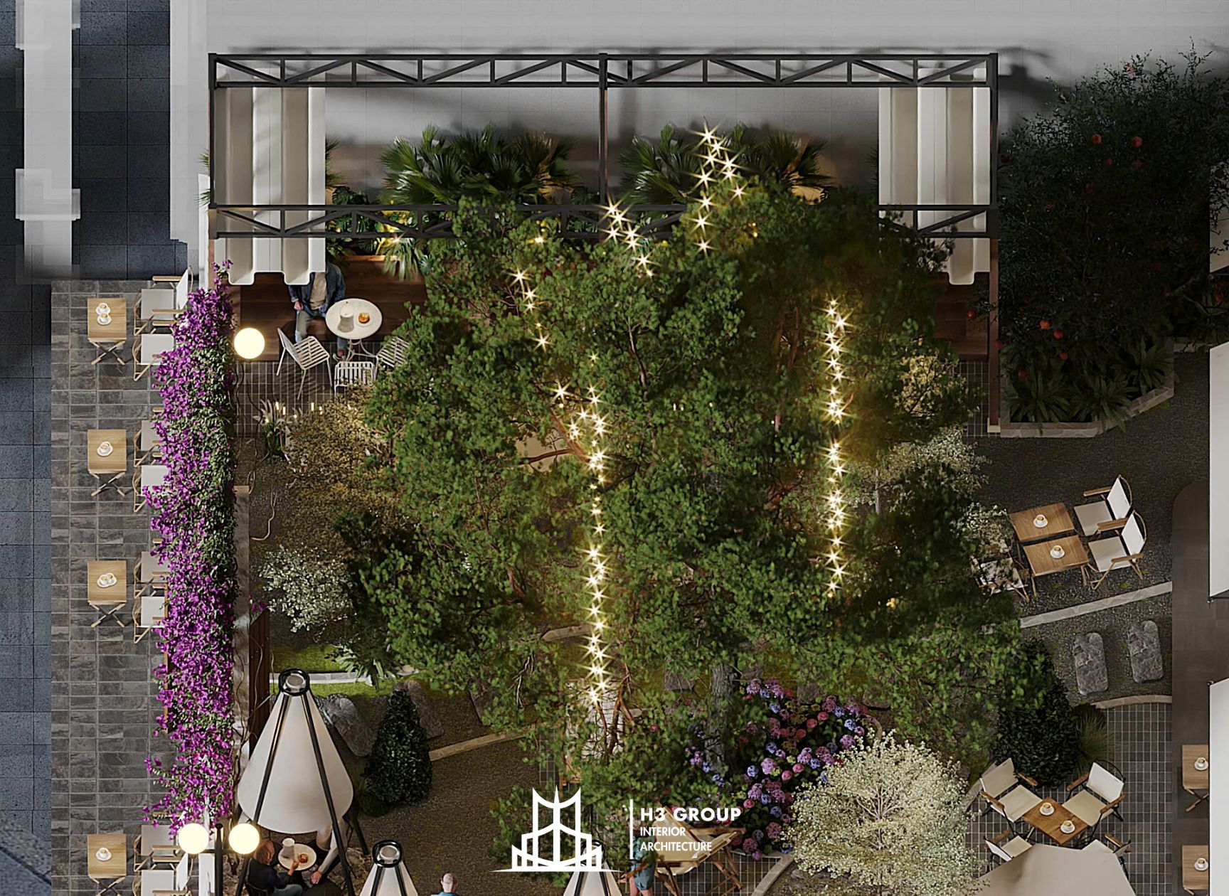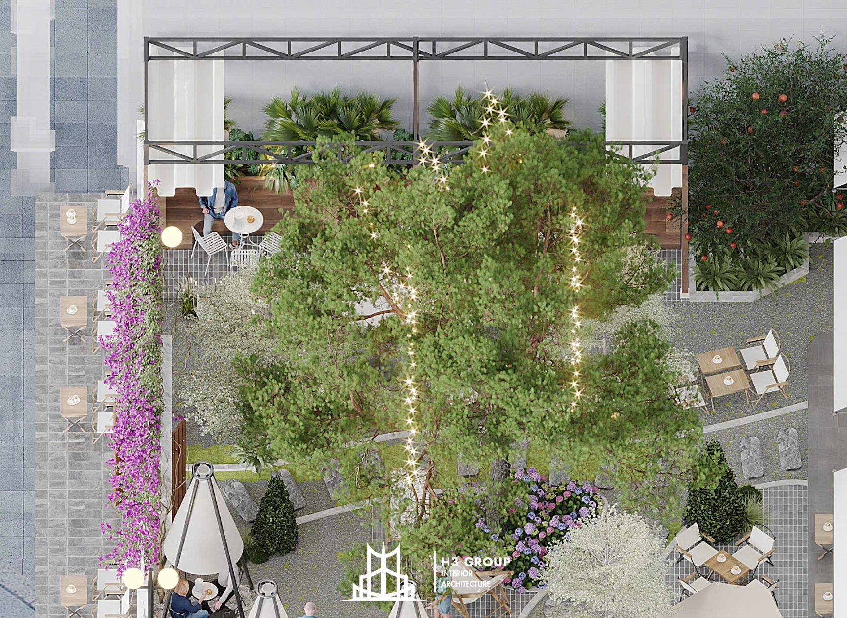 Trên diện tích 280m², H3 Group đã phân chia không gian linh hoạt và hợp lý giữa khu trong nhà 60m² và ngoài trời 220m², tạo nên nhịp điệu chuyển tiếp mềm mại giữa hai khối không gian.