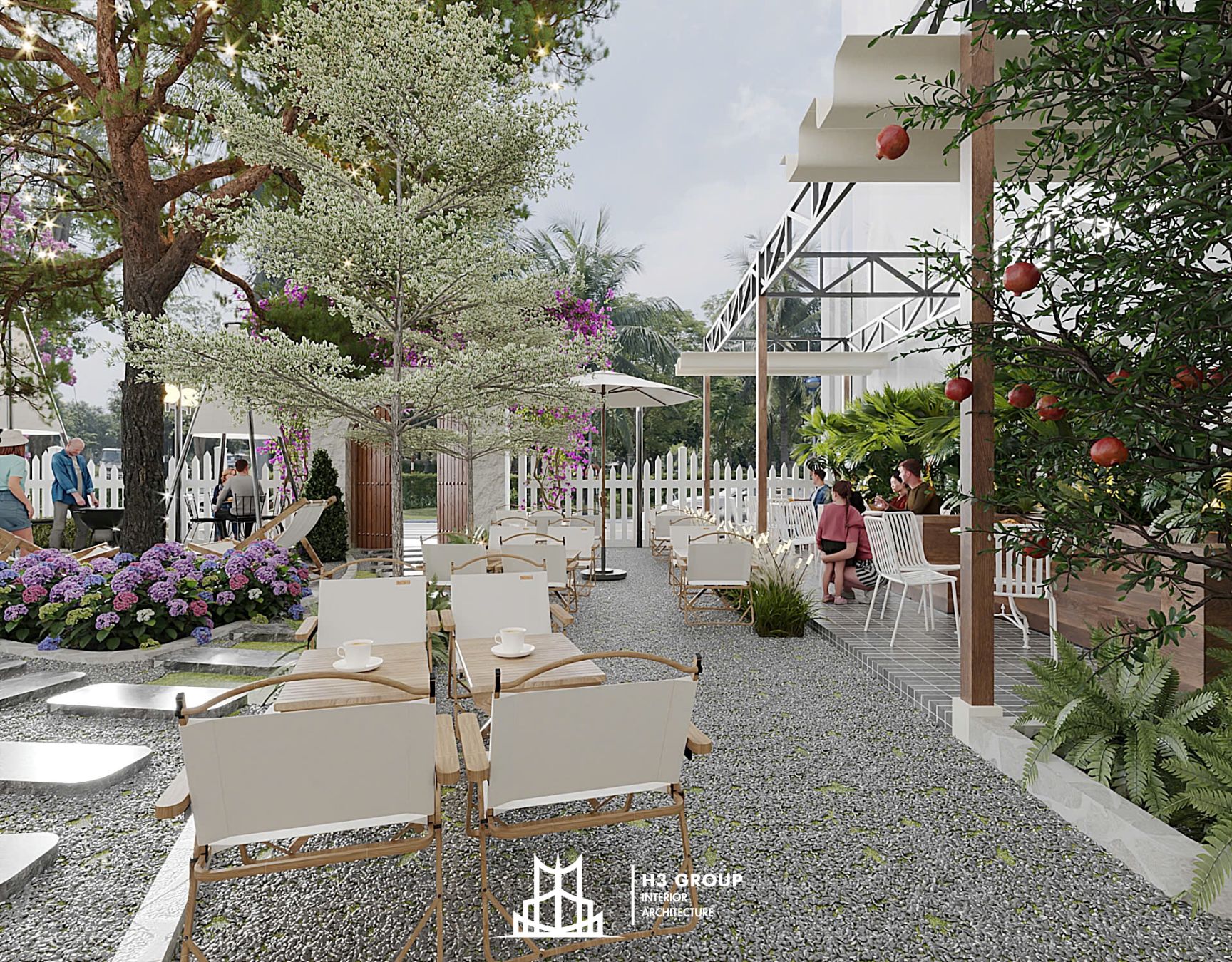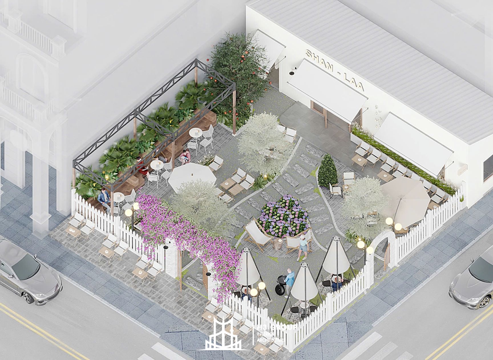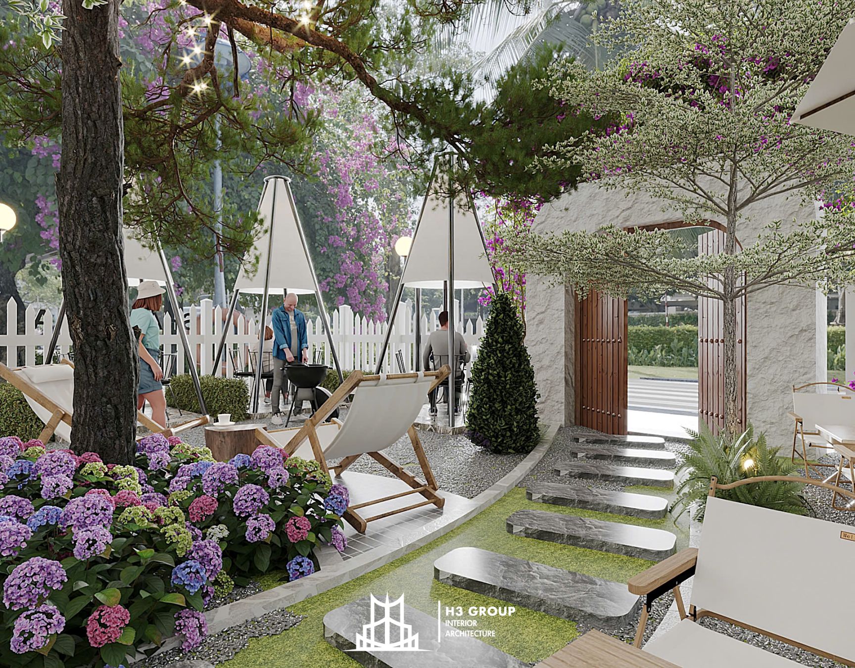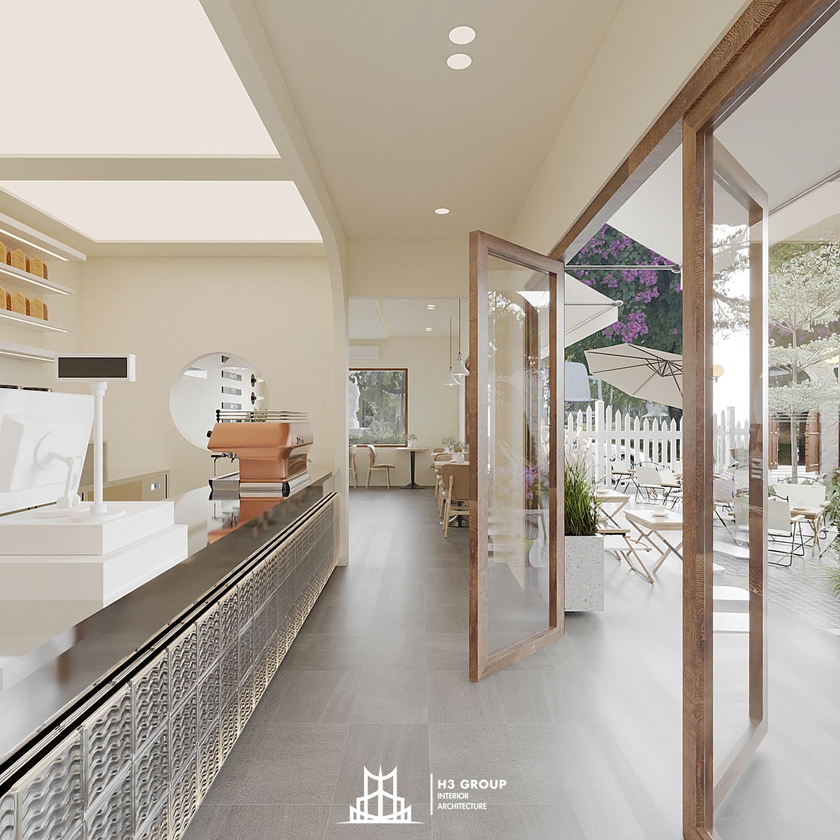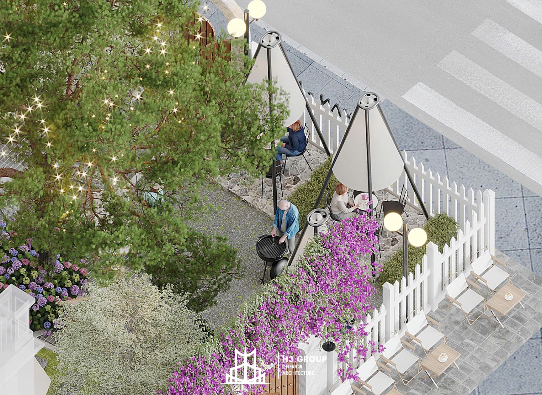 Trên diện tích 280m², H3 Group đã phân chia không gian linh hoạt và hợp lý giữa khu trong nhà 60m² và ngoài trời 220m², tạo nên nhịp điệu chuyển tiếp mềm mại giữa hai khối không gian.