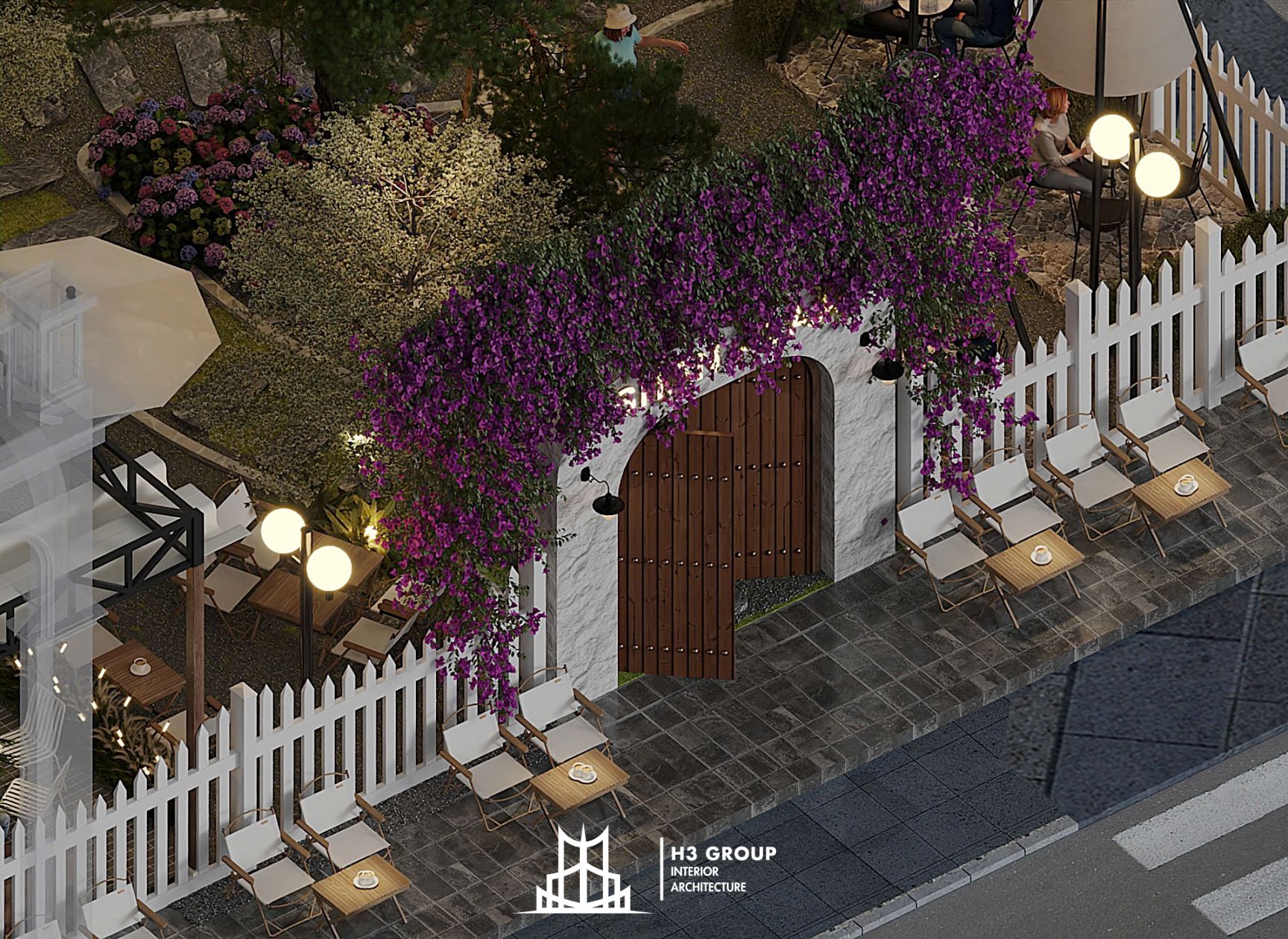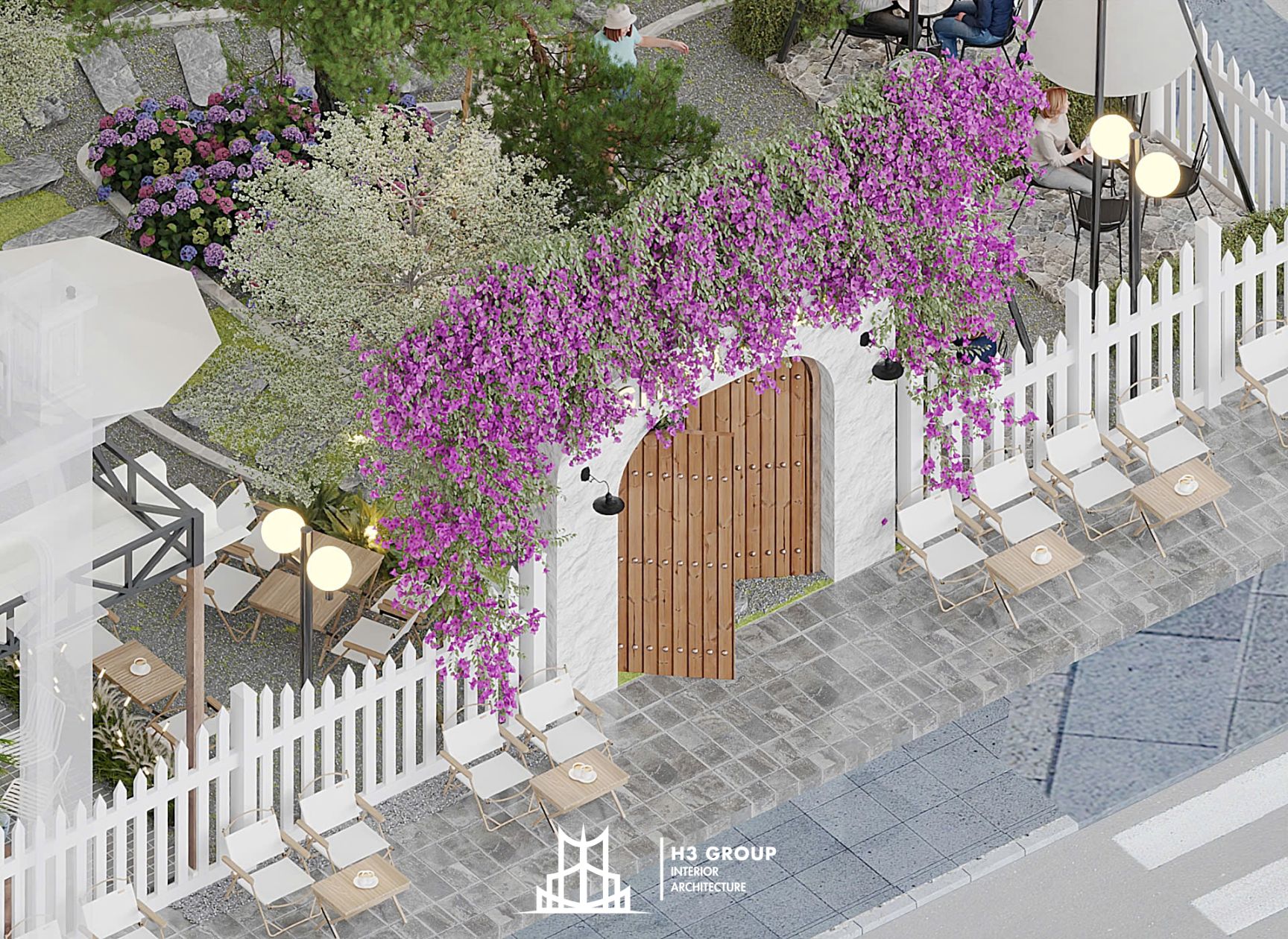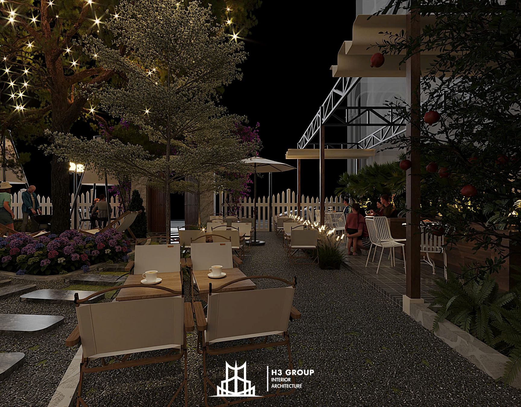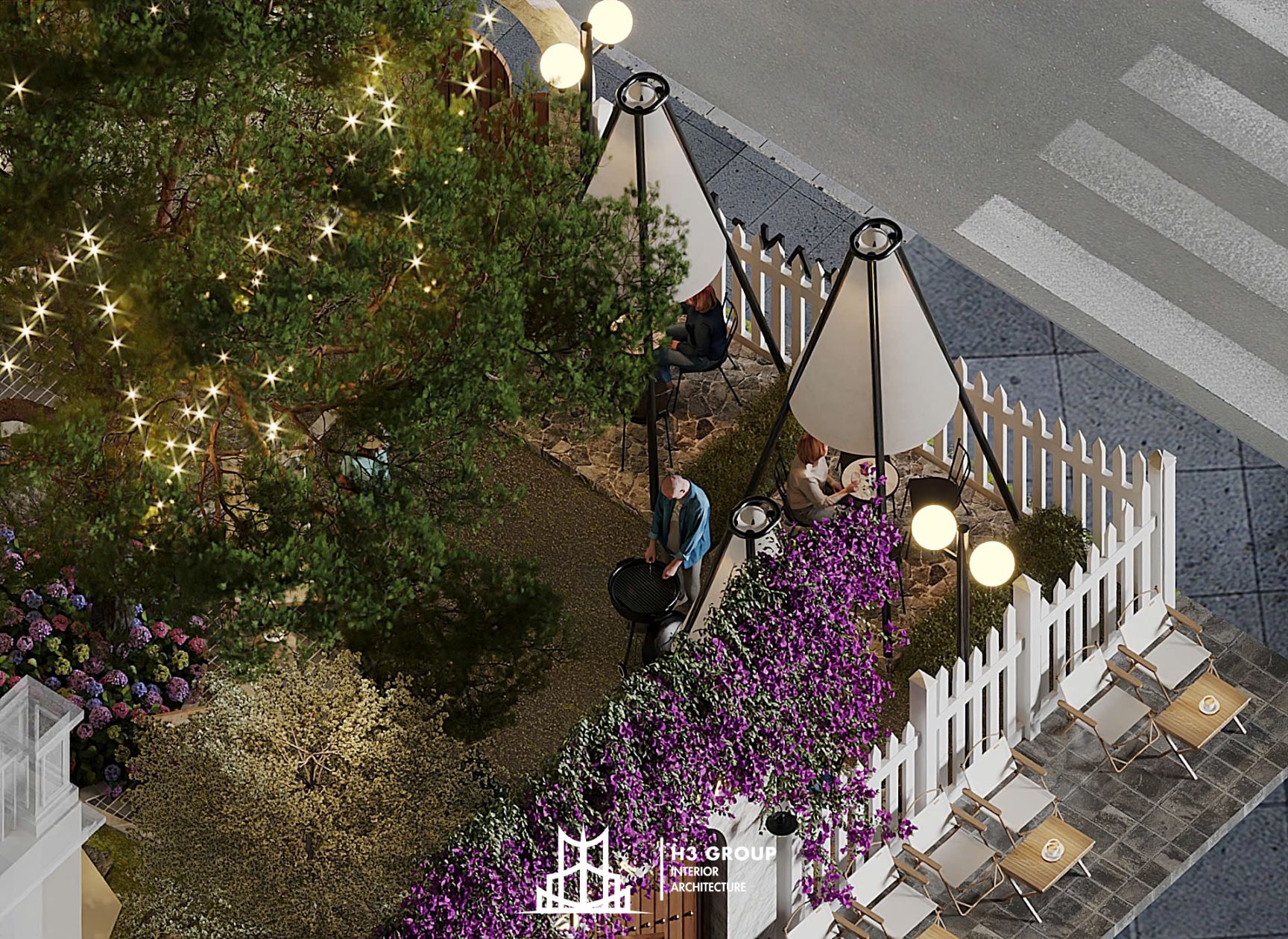 Trên diện tích 280m², H3 Group đã phân chia không gian linh hoạt và hợp lý giữa khu trong nhà 60m² và ngoài trời 220m², tạo nên nhịp điệu chuyển tiếp mềm mại giữa hai khối không gian.