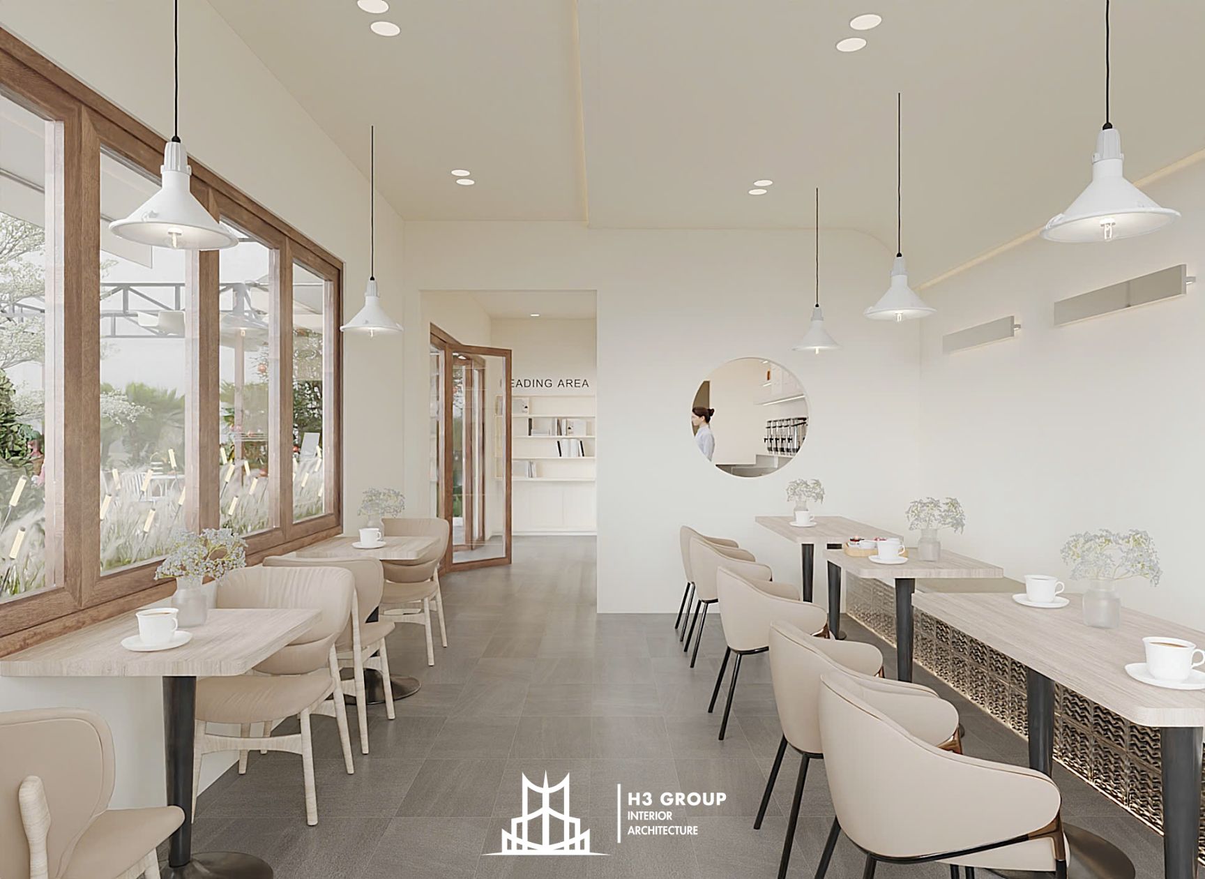 Khu trong nhà được thiết kế với tone trắng – be nhẹ nhàng, điểm xuyết chất liệu gỗ tự nhiên và kim loại ánh đồng, mang lại cảm giác tinh tế và hiện đại.