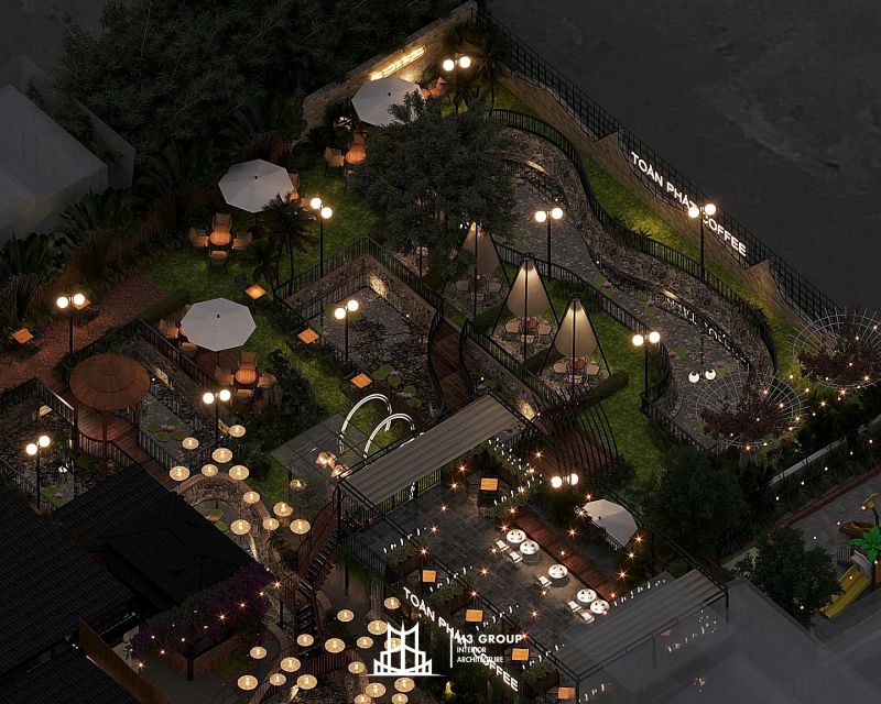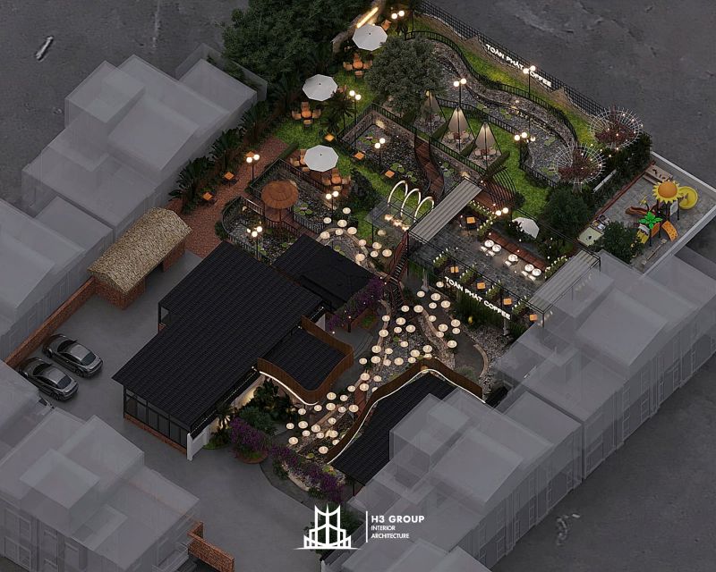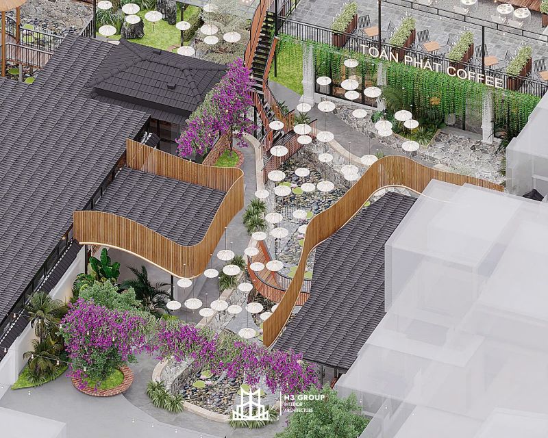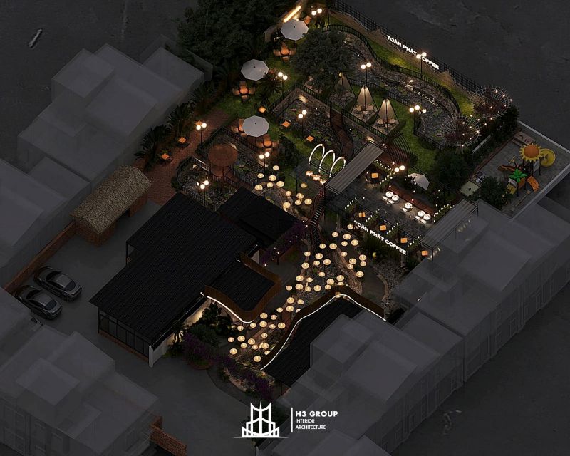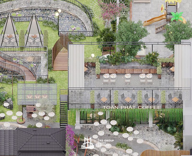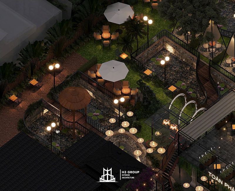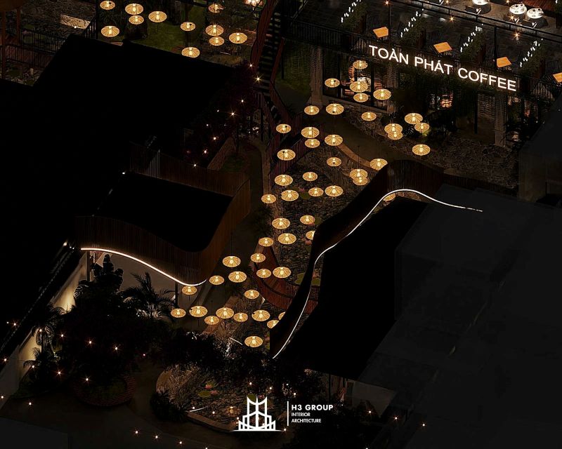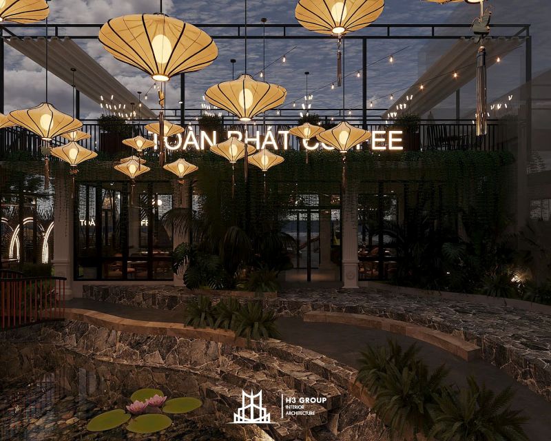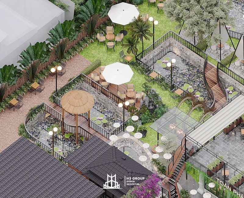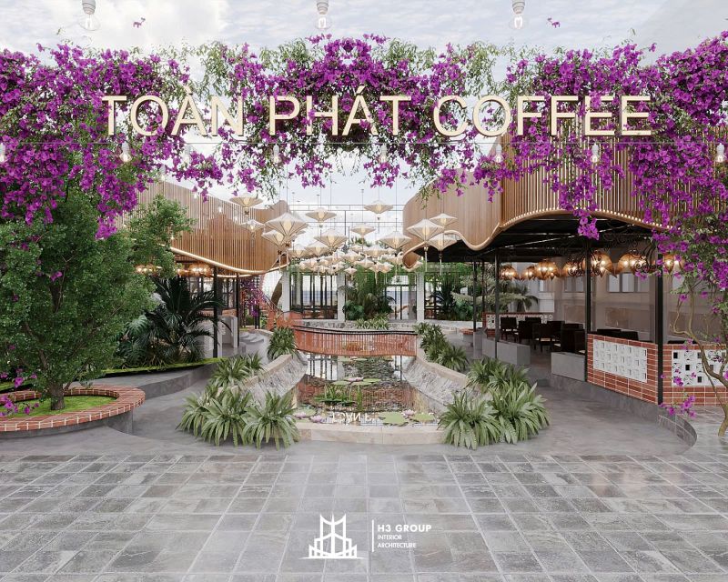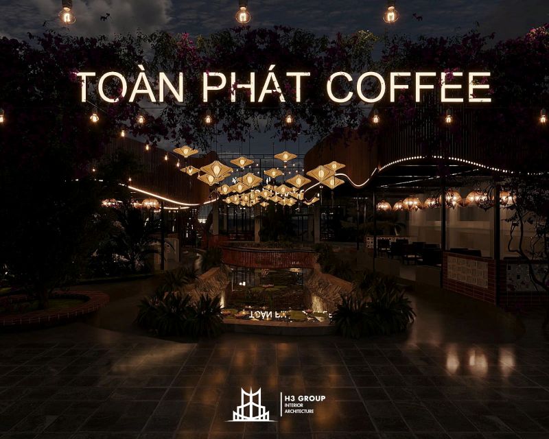 Toàn Phát Coffee là một dự án tổ hợp dịch vụ nhà hàng và cafe được lên ý tưởng, thiết kế trực tiếp bởi công ty H3 Group nằm tại trung tâm Thủy Nguyên, Hải Phòng. Với tổng diện tích 1.900m², dự án mang phong cách sân vườn hiện đại, tận dụng tối đa thiên nhiên hiện hữu như hồ nước và cây xanh bản địa để kiến tạo nên một không gian thư giãn – giải trí – kết nối đầy cảm hứng. Hãy cùng chúng tôi khám phá chi tiết thiết kế dự án Toàn Phát Coffee qua bài viết này nhé.