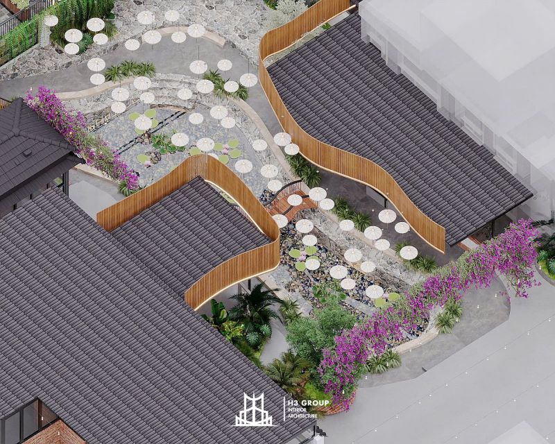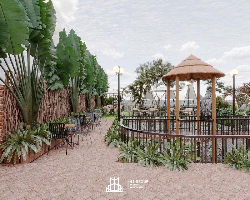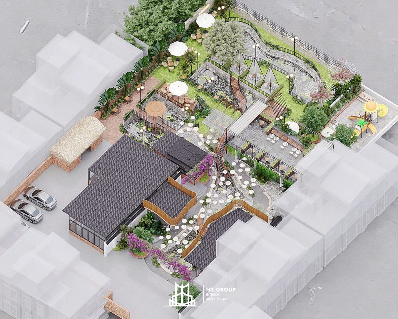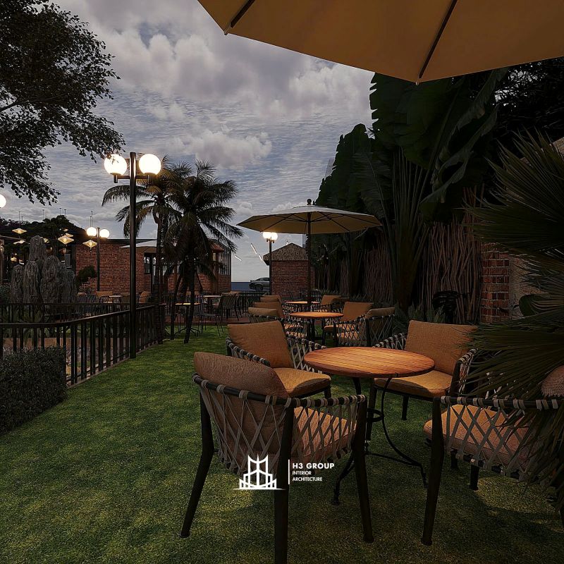 Sau khi nhận được đề bài và làm rõ với chủ đầu tư, đội ngũ nhân sự H3 Group đã nhanh chóng đo đạc lấy số liệu chính xác mặt bằng thi công và phương án phân chia khu vực sơ bộ. Dự án lần này, có lợi thế sở hữu hồ nước, ao tự nhiên và đã có sân vườn hiệu hữu, vì thế chúng tôi sẽ tận dụng tối đa các khu vực này tạo điểm nhấn hài hòa với thiên nhiên và khác biệt cho quán.
