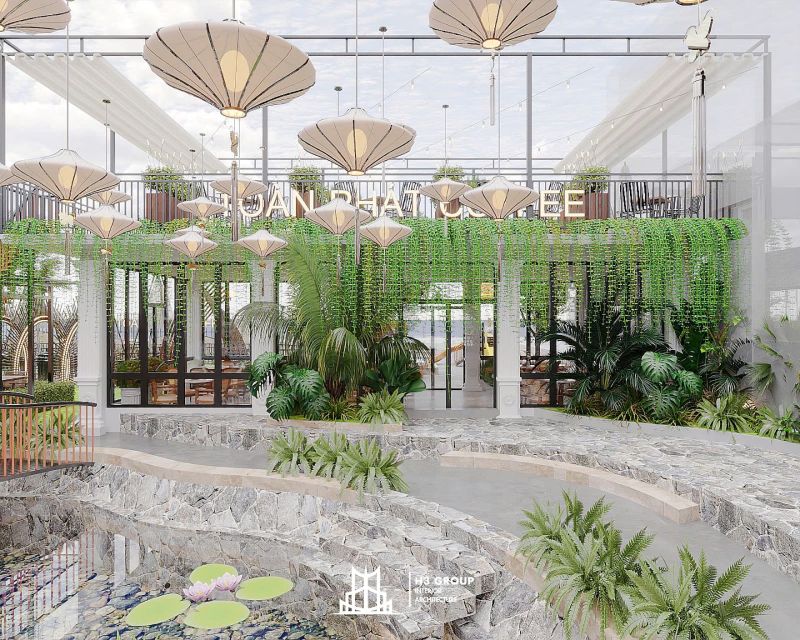 Tiến sâu vào không gian, làm khu vực cafe tạo nên một khu vực mát mẻ, dễ chịu, nơi khách hàng có thể thư giãn và tận hưởng không khí trong lành.