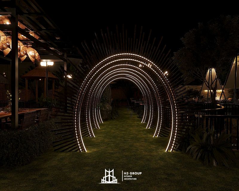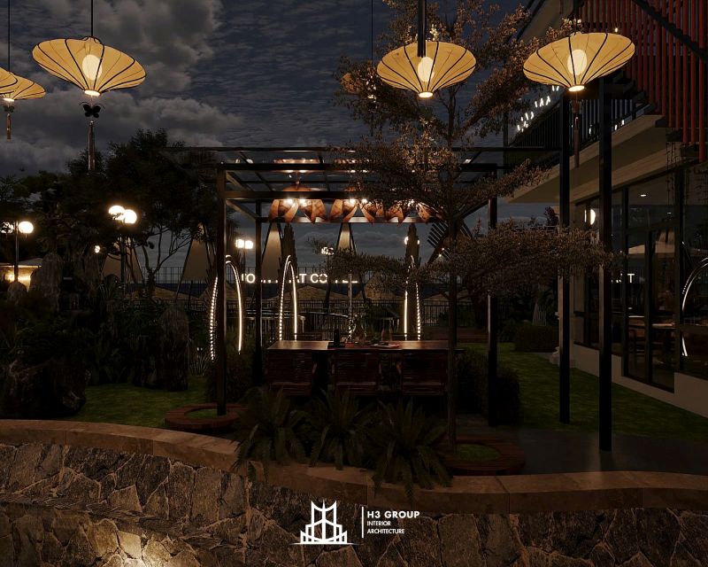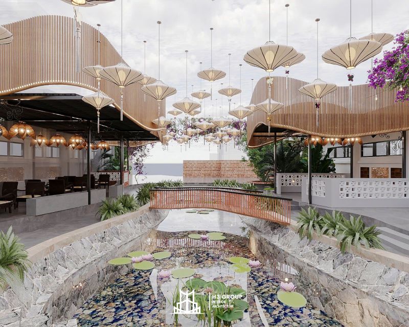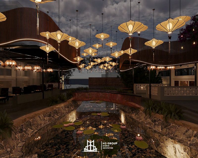 Hệ thống đèn lồng treo: Đèn lồng treo trên những cây cầu hay dọc theo bờ sông sẽ tạo ra không gian lãng mạn, ấm cúng và đầy sắc màu vào buổi tối. Đây sẽ là điểm nhấn đặc biệt, thu hút khách hàng đến thưởng thức cảnh quan và trải nghiệm dịch vụ.